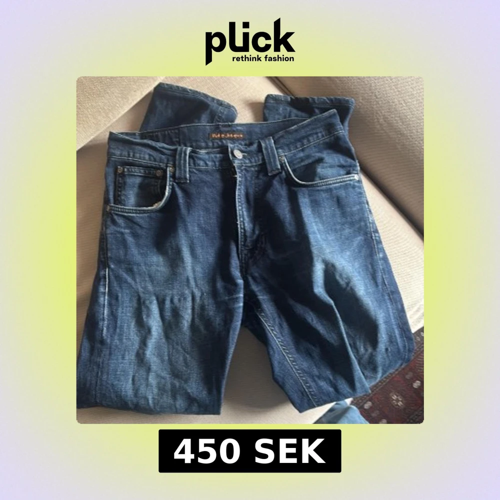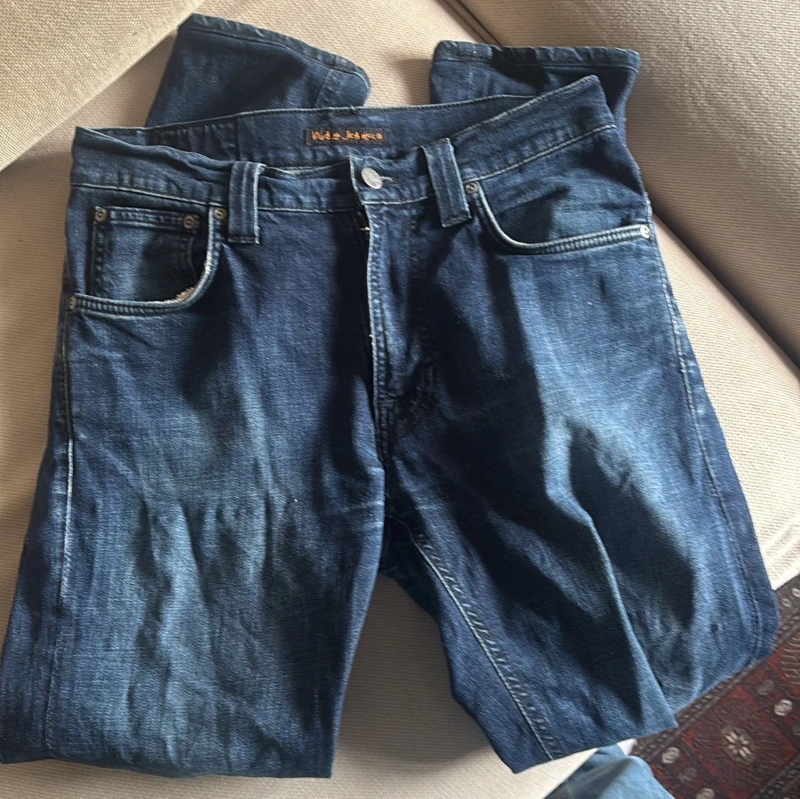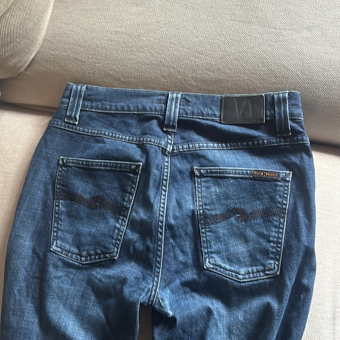 Säljer ett par klassiska blå jeans från Nudie Jeans med snygg tvätt och kontrastsömmar. Byxorna har fem fickor, bälteshällor och Nudie-logga på bakfickan. Perfekta för dig som gillar en tidlös och avslappnad stil.