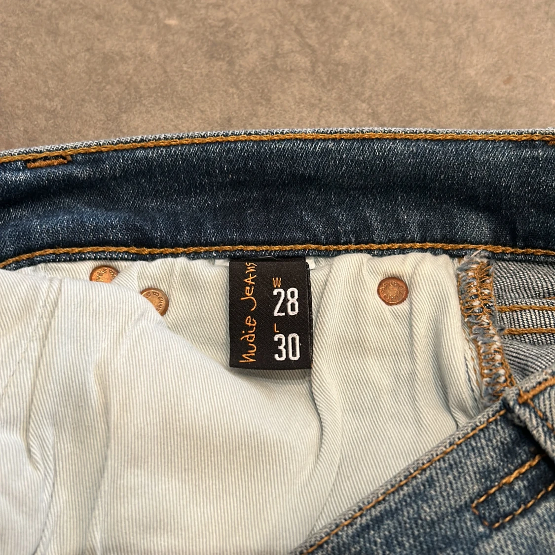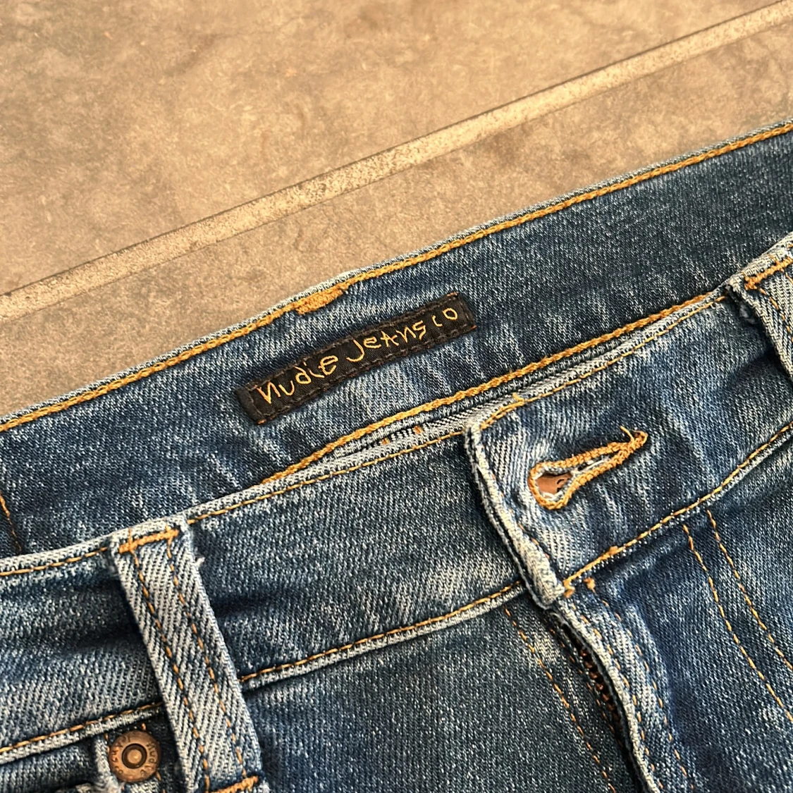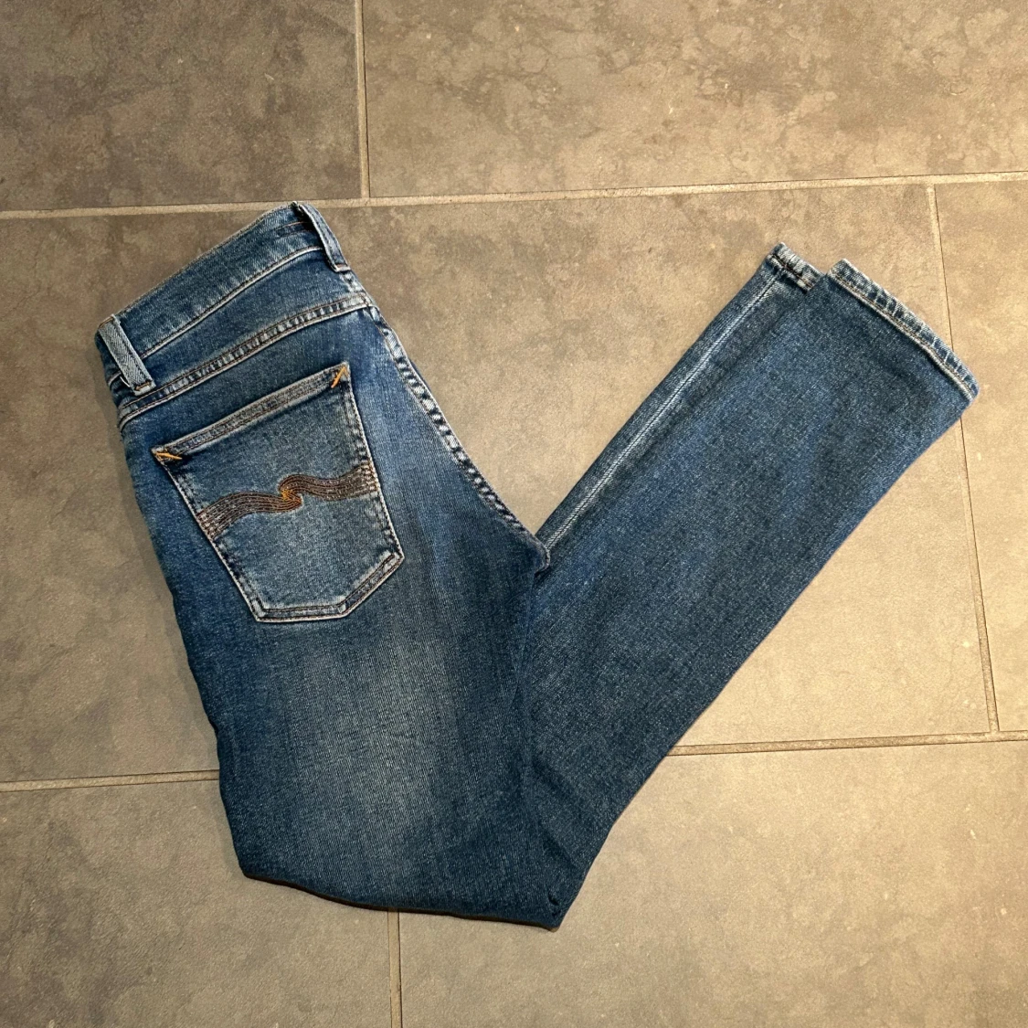 Snygga blå jeans från Nudie Jeans Co med klassisk femficksdesign och kontrastsömmar. Jeansen har en rak passform och coola broderade detaljer på bakfickorna. Perfekta för dig som gillar en tidlös och avslappnad stil. Modellen heter tight terry och sitter väldigt bra. Storlek 28/30. Ny pris: 1600kr. Priset går lätt att ta ner så fråga vad ni vill!