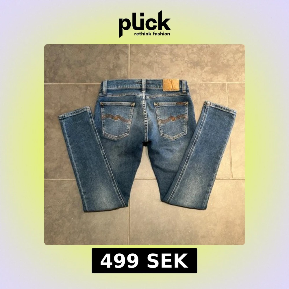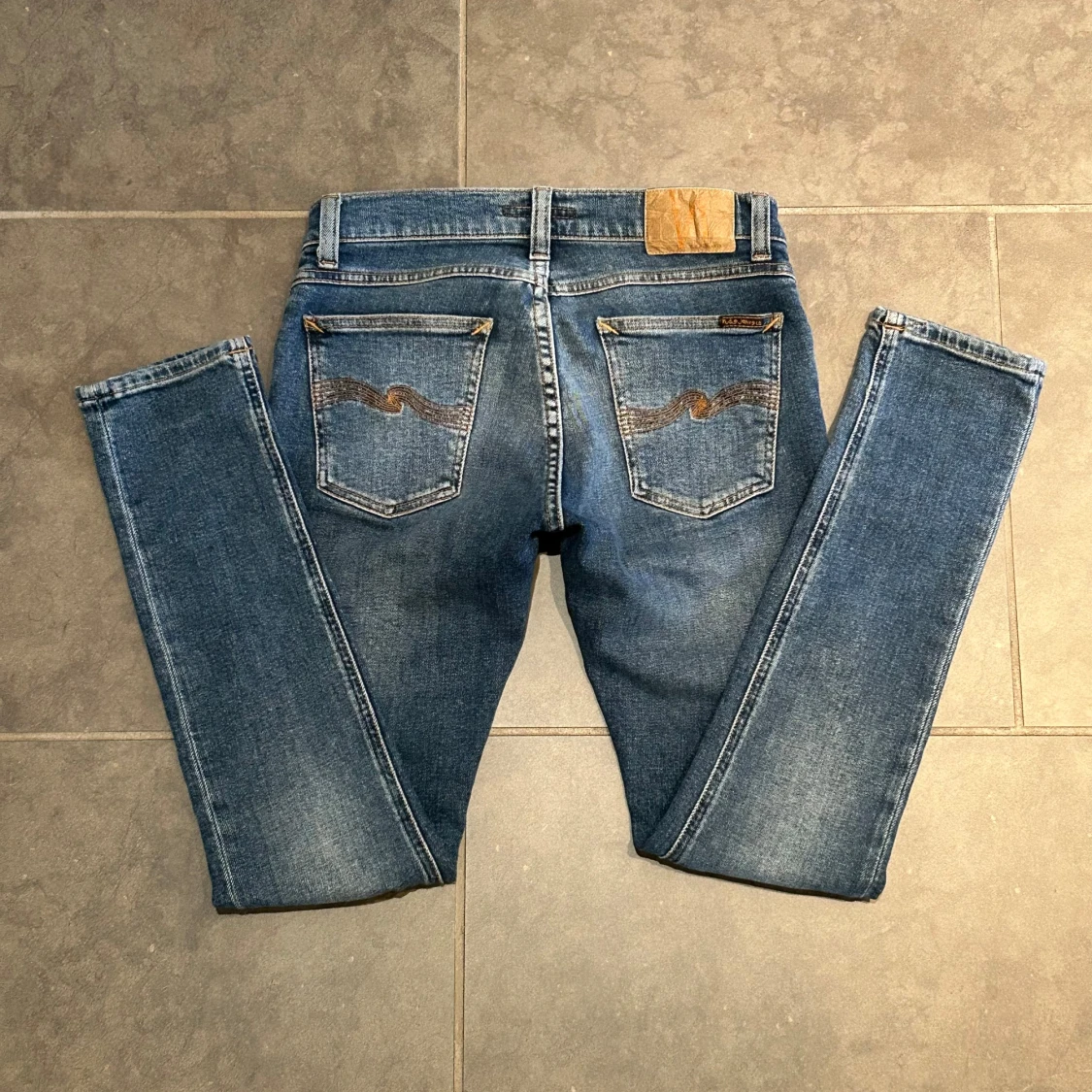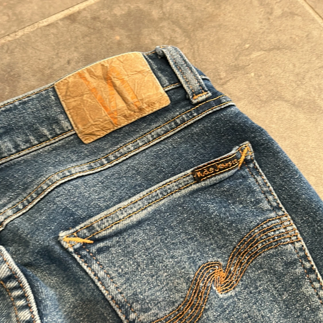 Snygga blå jeans från Nudie Jeans Co med klassisk femficksdesign och kontrastsömmar. Jeansen har en rak passform och coola broderade detaljer på bakfickorna. Perfekta för dig som gillar en tidlös och avslappnad stil. Modellen heter tight terry och sitter väldigt bra. Storlek 28/30. Ny pris: 1600kr. Priset går lätt att ta ner så fråga vad ni vill!