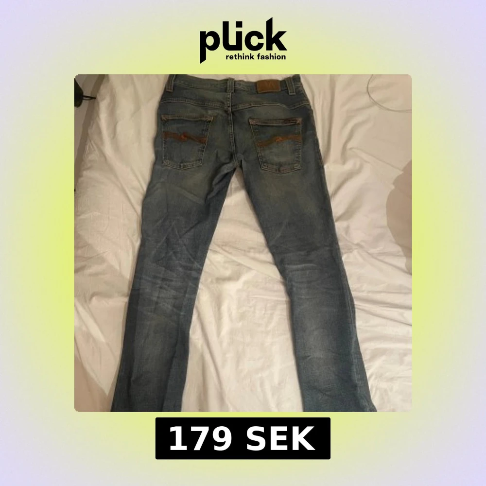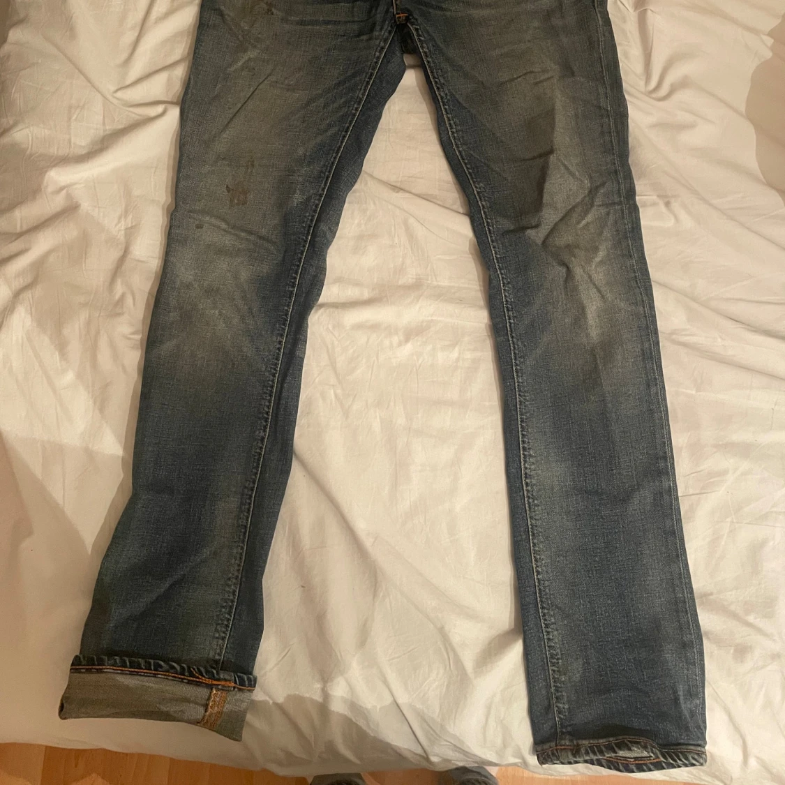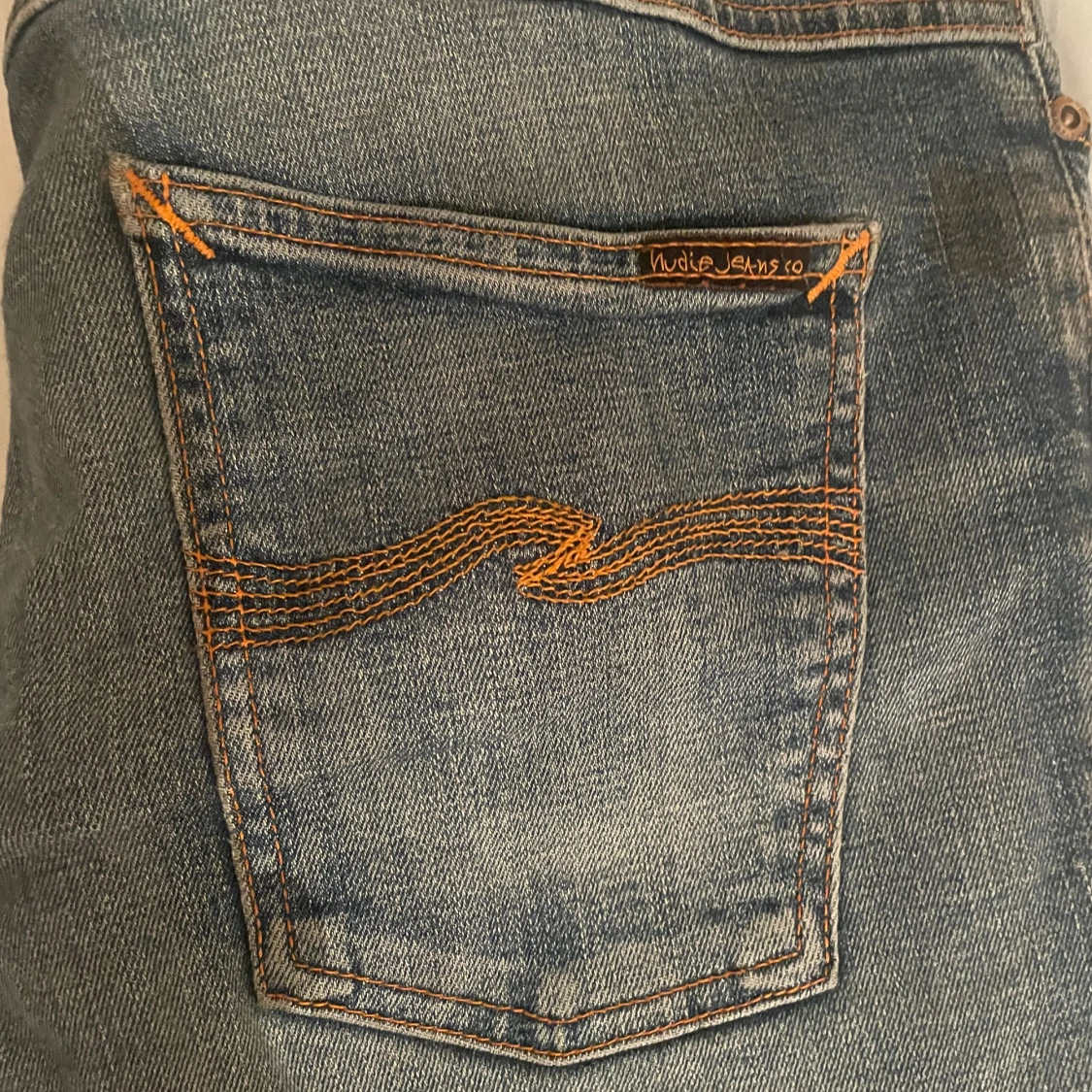 Säljer ett par klassiska blå jeans från Nudie Jeans med orangea sömmar och signaturbroderi på bakfickorna. Jeansen har en rak passform och är tillverkade i slitstarkt bomullsdenim. Perfekta för dig som gillar en tidlös och avslappnad stil.