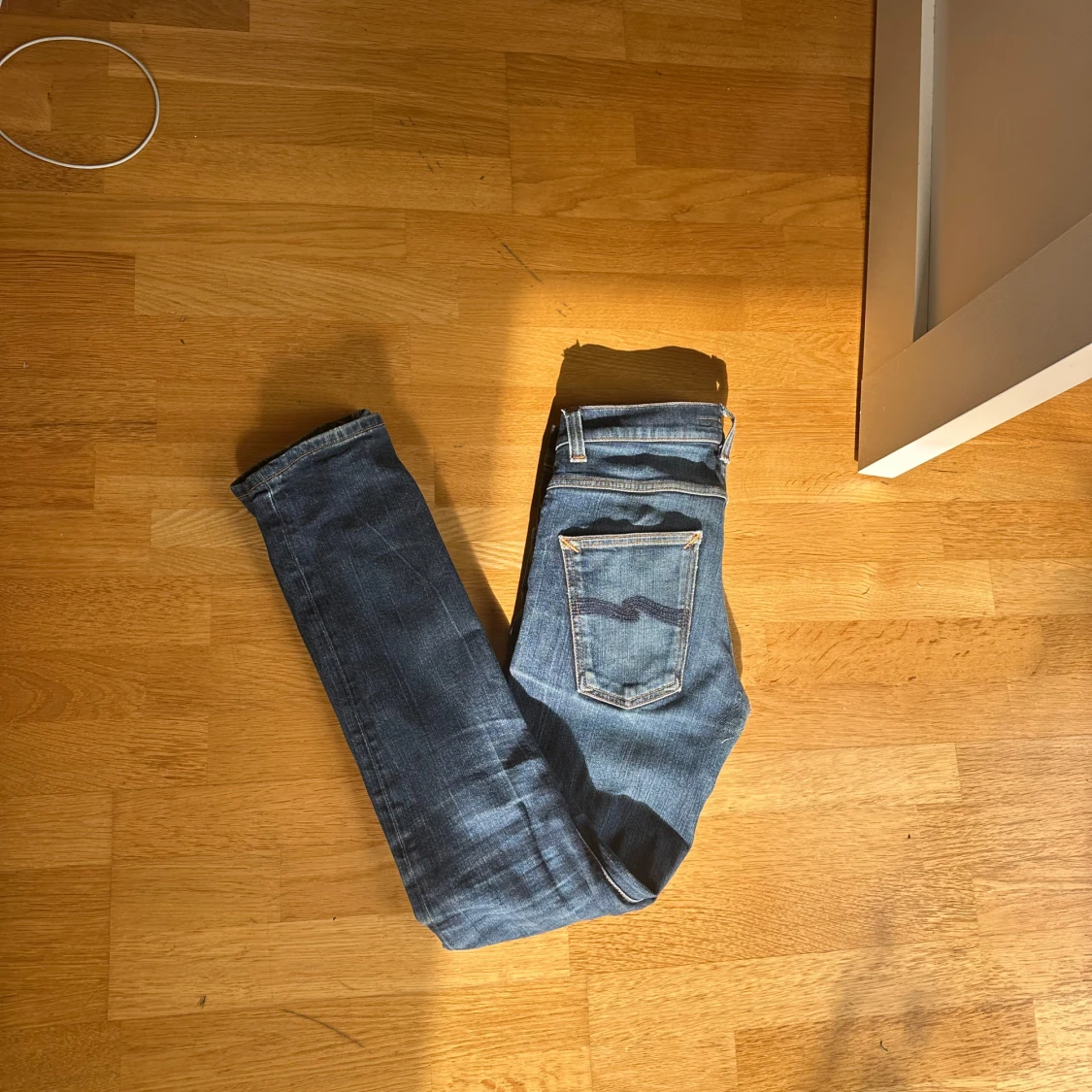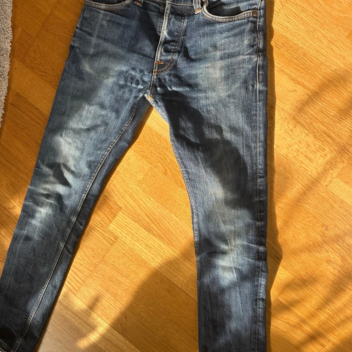 Säljer ett par klassiska blå jeans från Nudie Jeans med snyggt slitna detaljer och kontrastsömmar. Modellen är Grim Tim som har smal passform, fem fickor och Nudie-loggan på bakfickan. Perfekta för dig som gillar en stilren och avslappnad look.