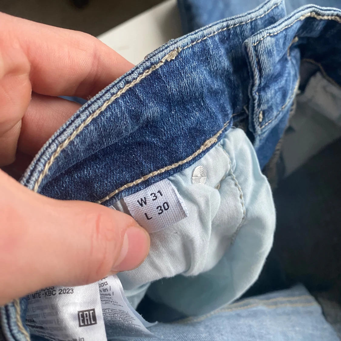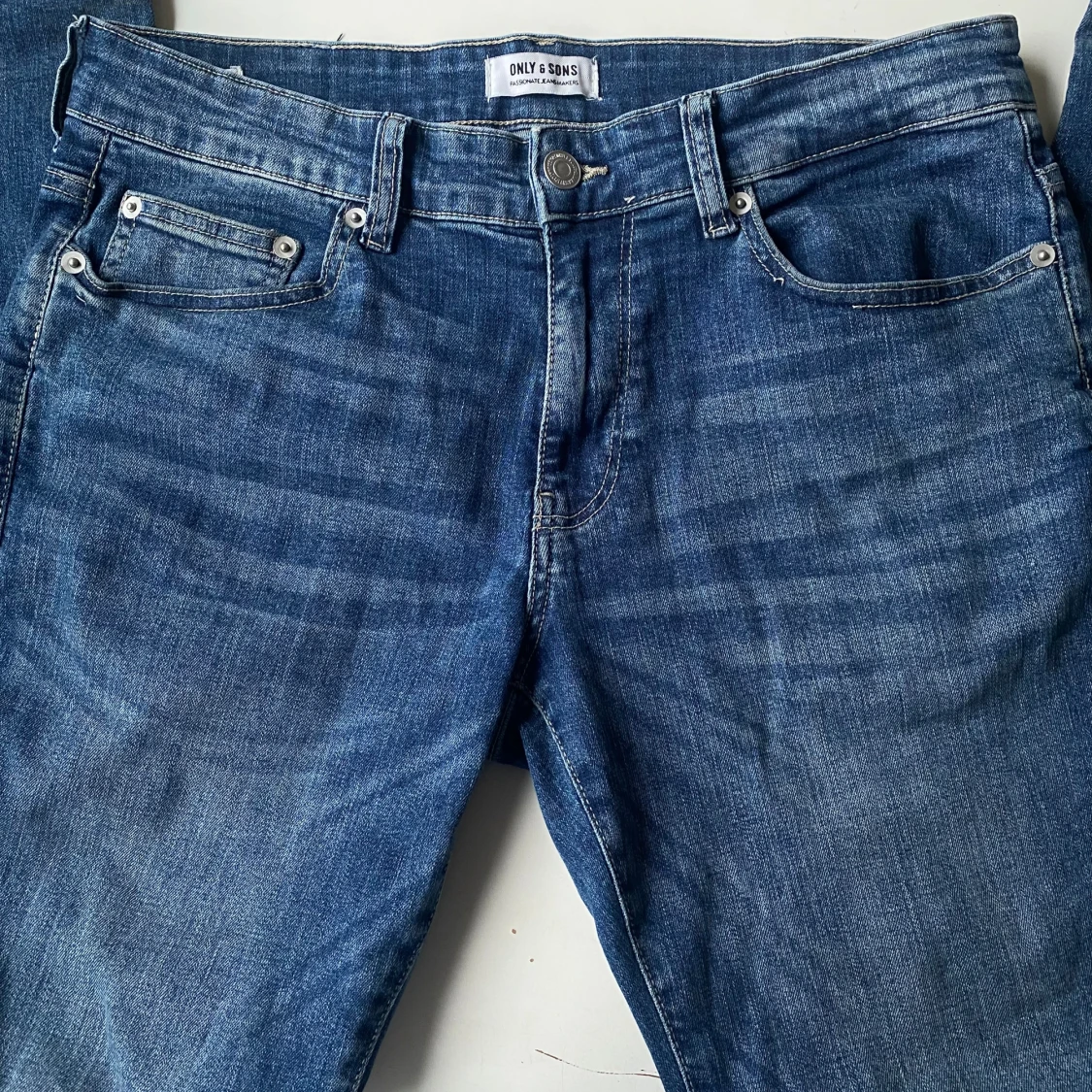 Snygga blå jeans från Only & Sons med klassisk femficksdesign och knappgylf. Jeansen har en normal pass form. Tillverkade i slitstarkt denim som ger en tidlös look. Storleken är W31 L30