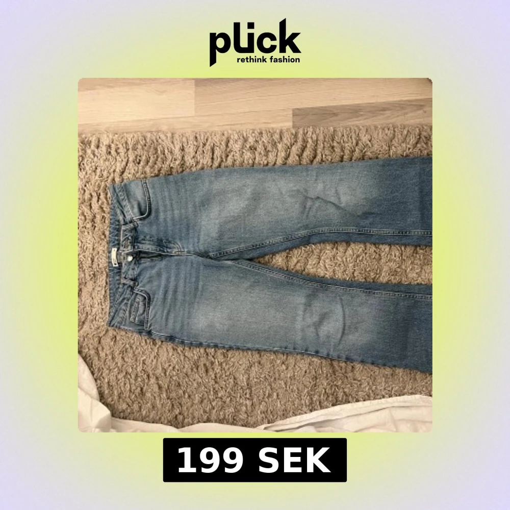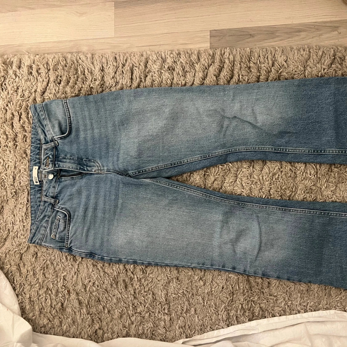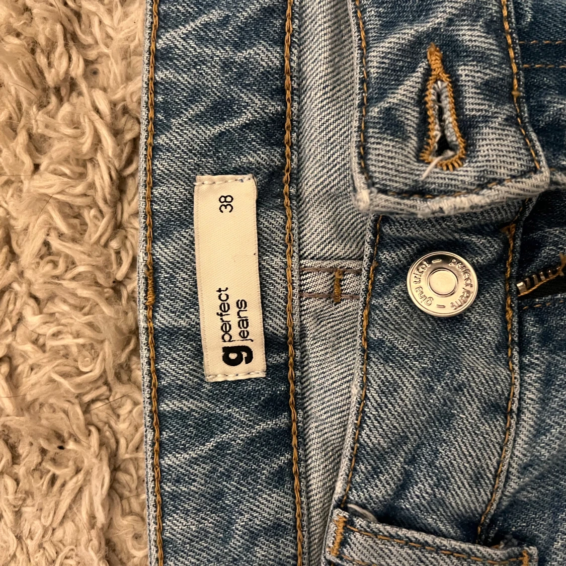 Snygga blå jeans från Gina i storlek 38. De har en klassisk femficksdesign med knapp och dragkedja framtill. Utsvängda .