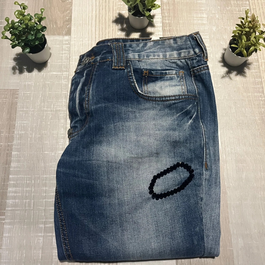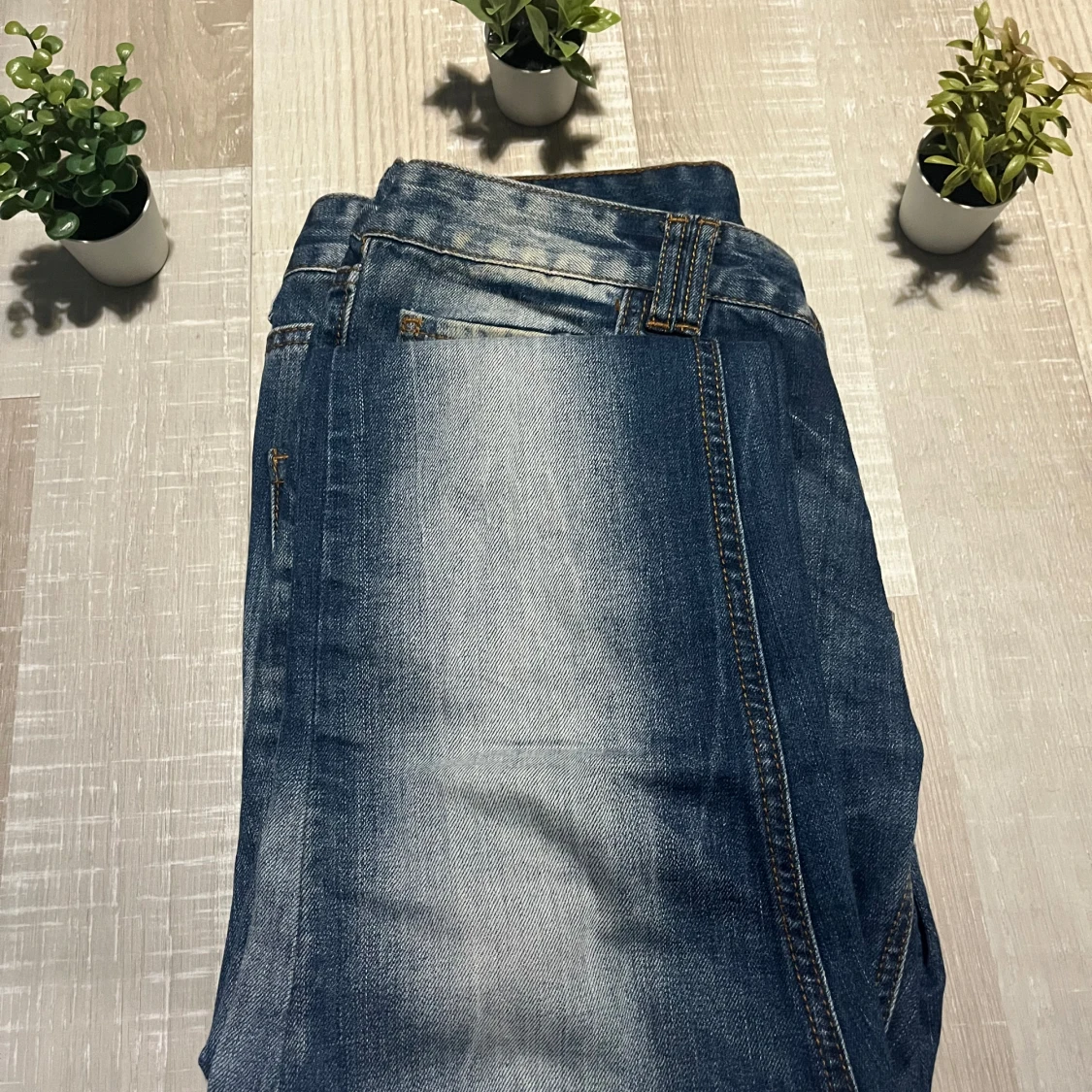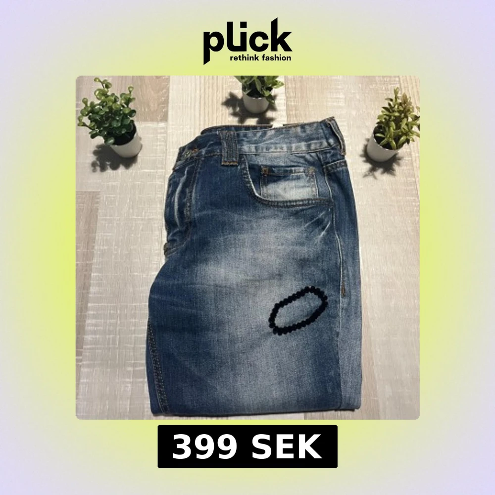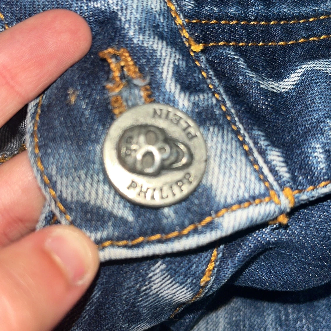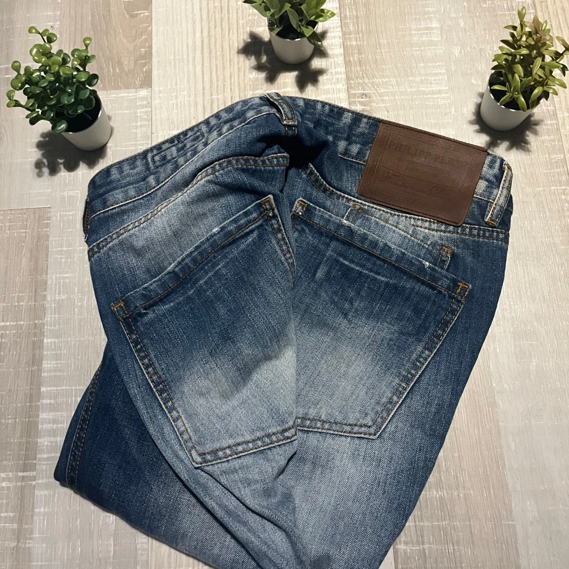 Snygga blå jeans från Philipp Plein med slitna detaljer och klassisk femficksdesign. Jeansen har en mörkblå tvätt med ljusare partier och kontrastsömmar. Metallknapp med logga och läderpatch bak i midjan ger extra edge. Jätte bra skick endast används någon enstaka gång!