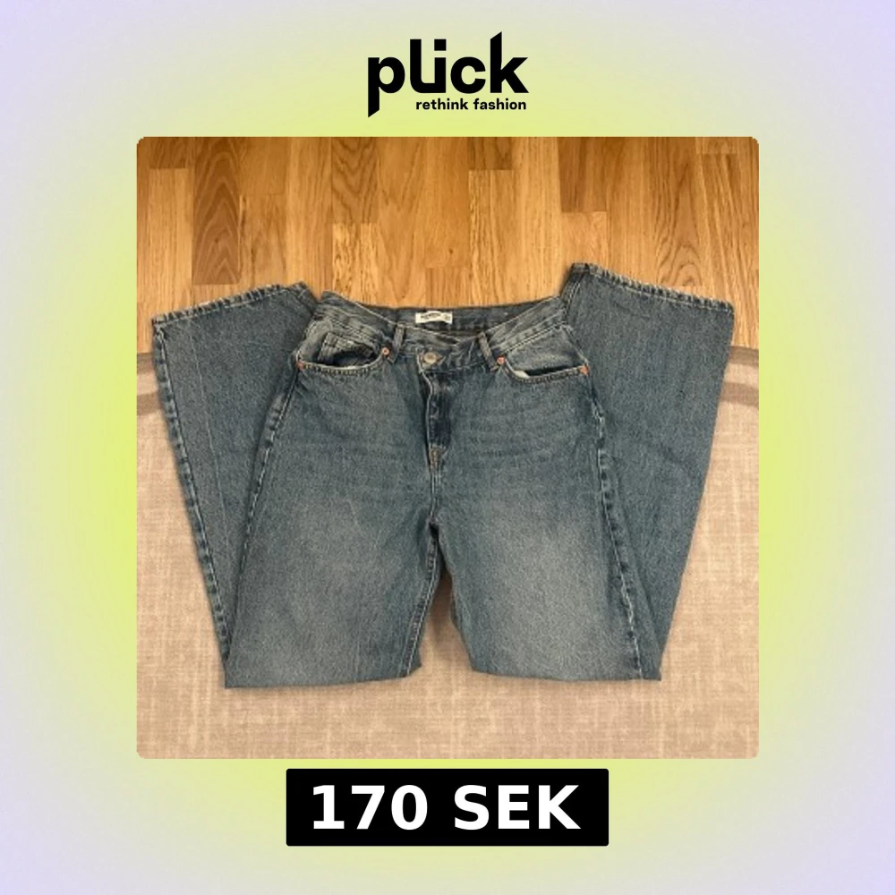Säljer ett par klassiska blå jeans från Pull&Bear. De har en straight passform och är tillverkade i denim. Perfekta för en avslappnad stil. Jeansen har en V design på framsidan
