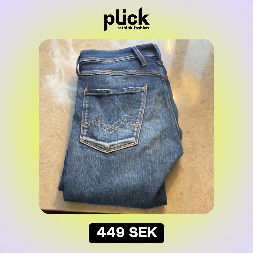 Säljer ett par snygga blå jeans från Replay, modell Anbass. De är i slim fit och har en klassisk femficksdesign med dragkedja och knapp. Perfekta för både vardag och fest! 🕺