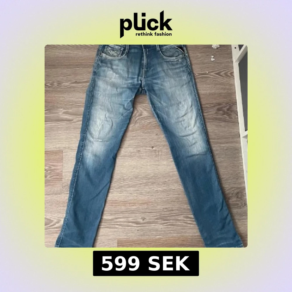 Snygga blå jeans från Replay i modellen Anbass. De har passformen Anbass vilket är slim fit. De är köpta för 2 veckor sedan och jag säljer dem pga att de är för små för mig. De är i jätte fint skick. Nypris ligger på 1899 och mitt pris är 599