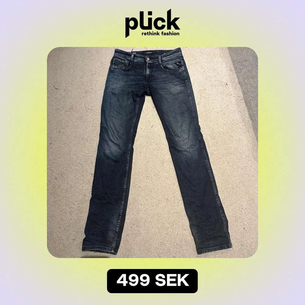Säljer ett par snygga blå jeans från Replay i bra skick. De har en klassisk femficksdesign och en bekväm passform. Perfekta för både vardag och fest! 🕺storlek 29/32 men sitter som 30/32