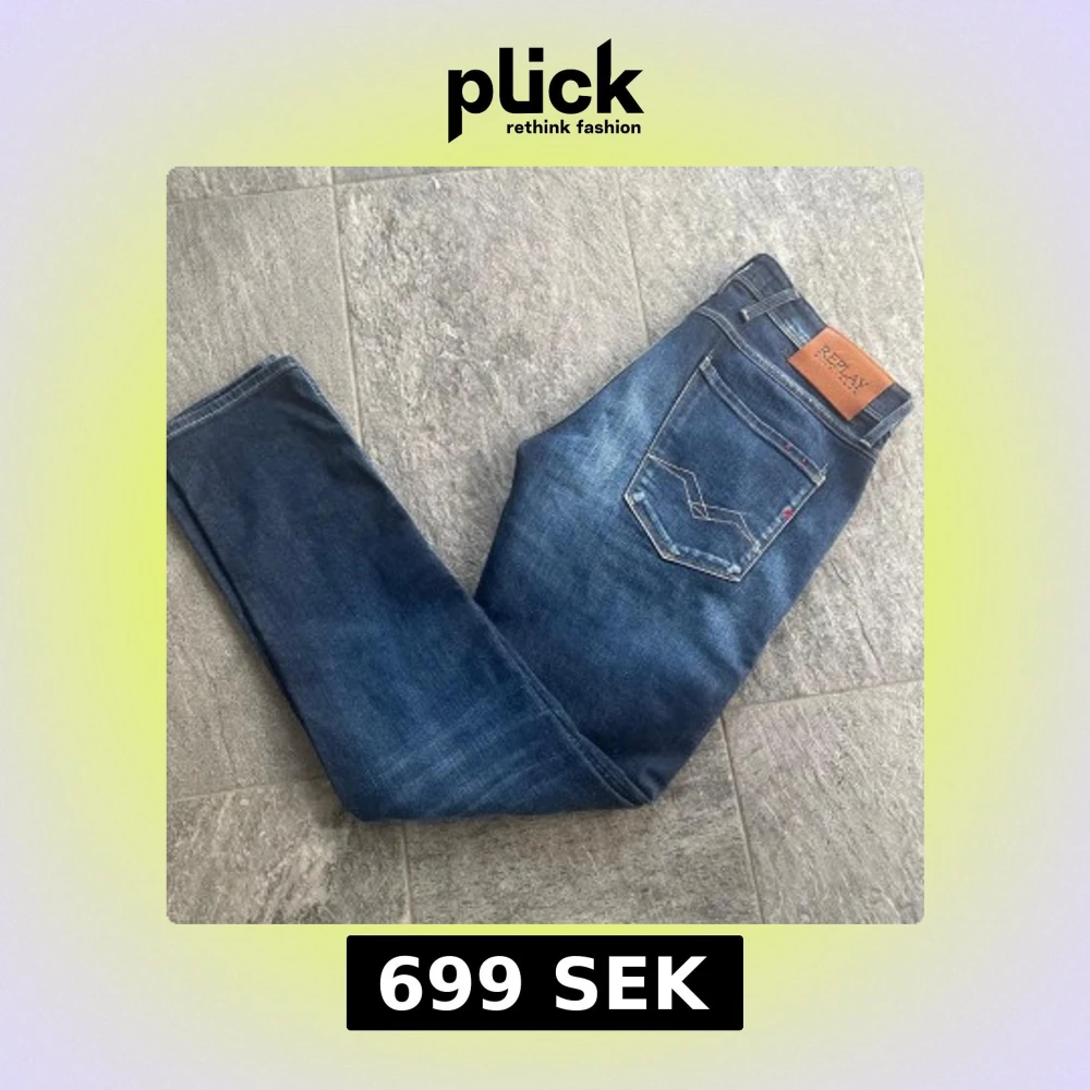 Snygga blå jeans från Replay i modellen Anbass. De har en slim fit passform och är tillverkade i jeansmaterial. Perfekta för en stilren look med klassiska femficksdetaljer. Väldigt bra skick på de eftersom de är använda en gång. Fråga vid minsta lilla fundering!