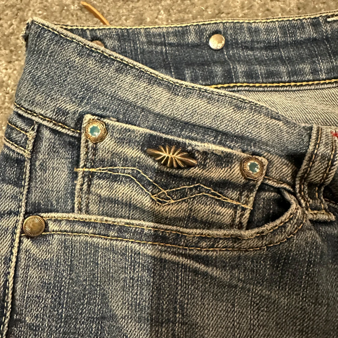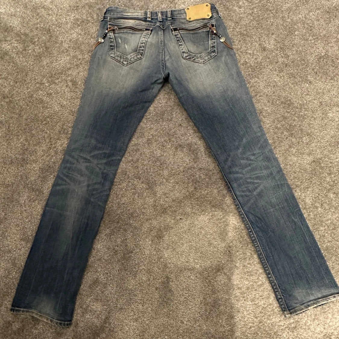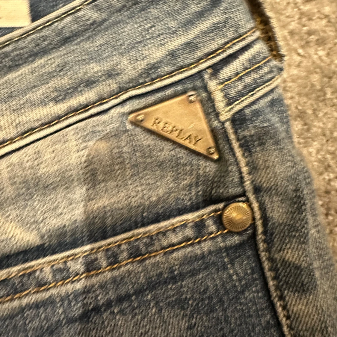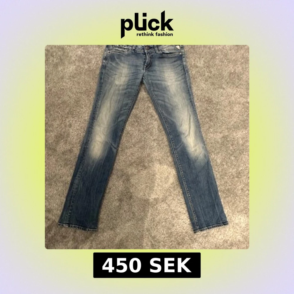 Snygga blå jeans från Replay med en klassisk femficksdesign och coola detaljer som metallknappar och nitar. Jeansen har en lätt tvättad look en normal passform som passar perfekt till vardags. En defekt som visas på sista bilden, vid fler frågor eller bilder är det bara att skriva