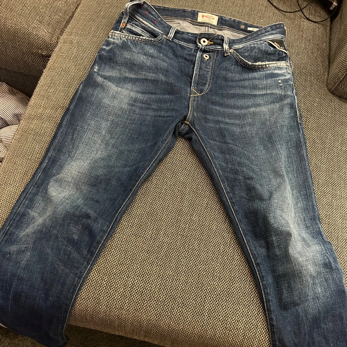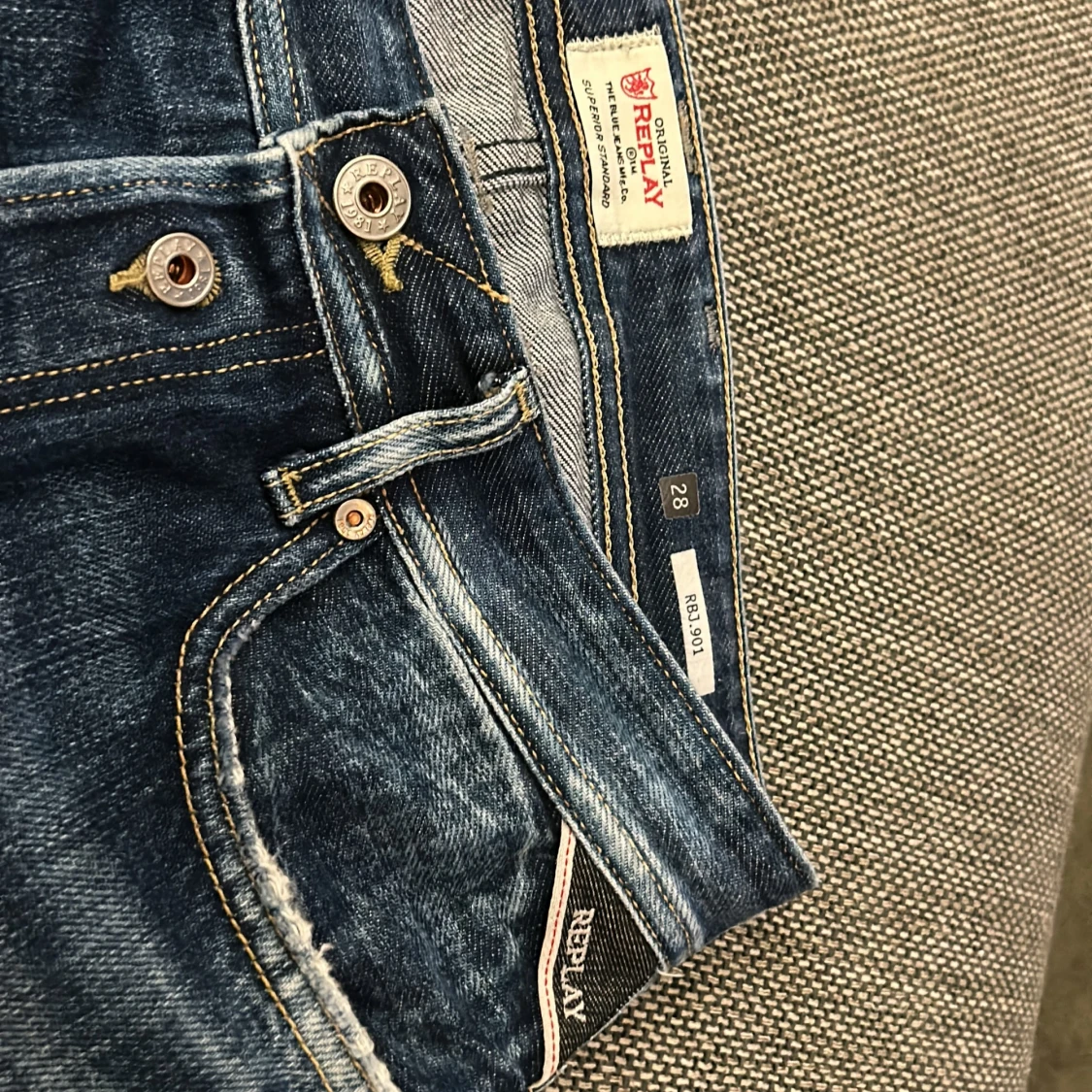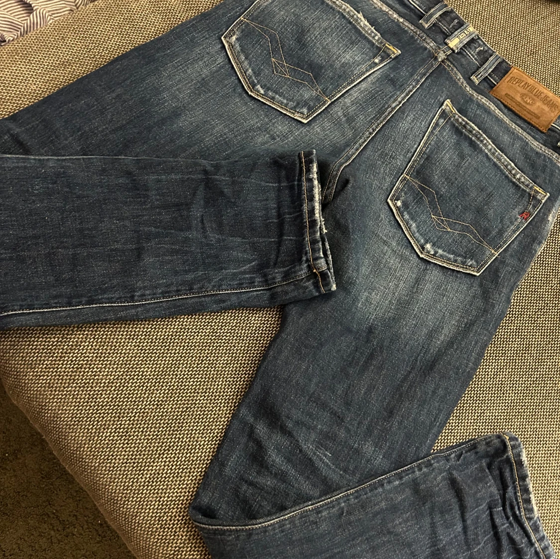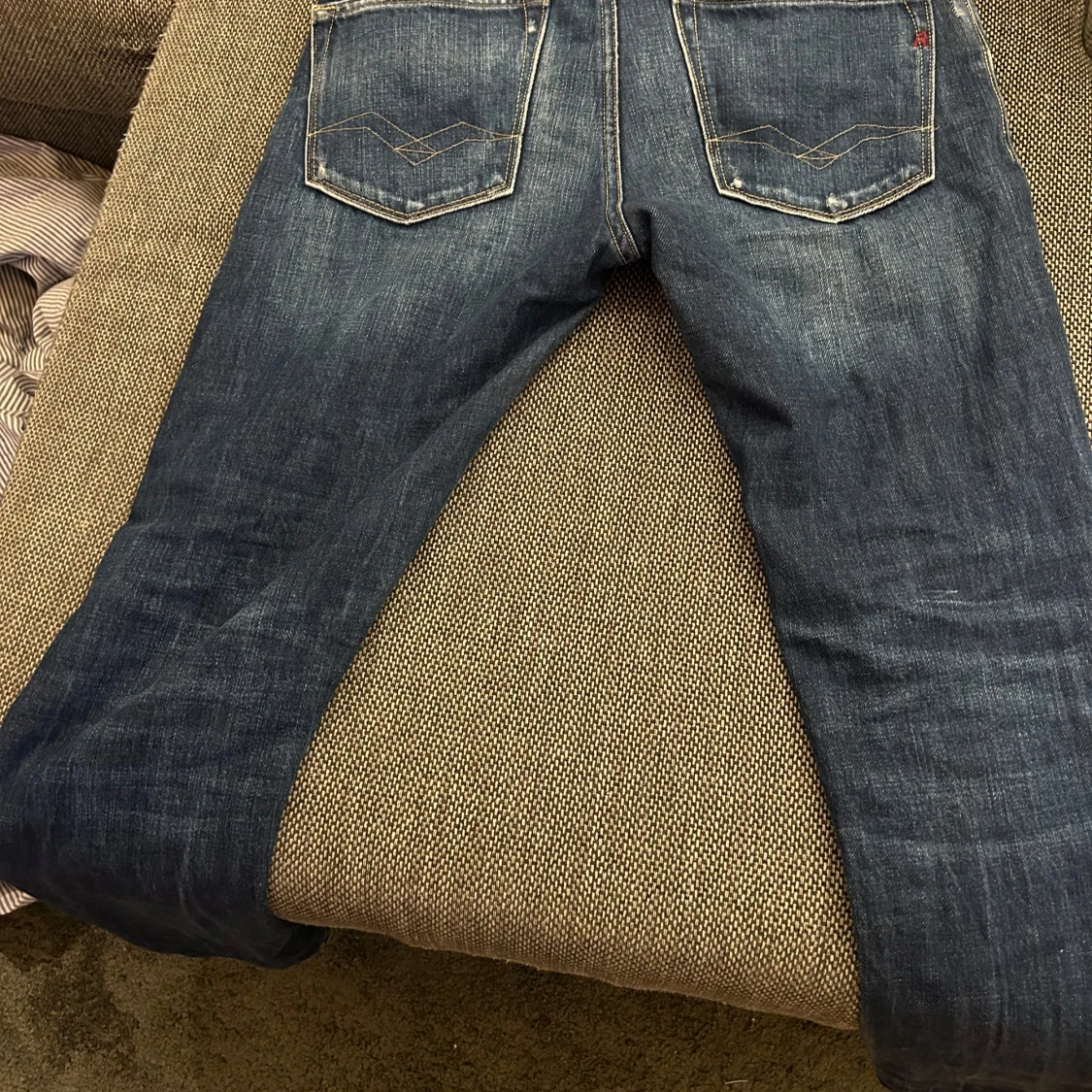 Säljer ett par snygga blå jeans från Replay i modellen Anbass. Storlek 28, men dem är 28 i midjan och 31, 32. Personen i bilden är 174 och dom passar parfekt. Använt två gånger