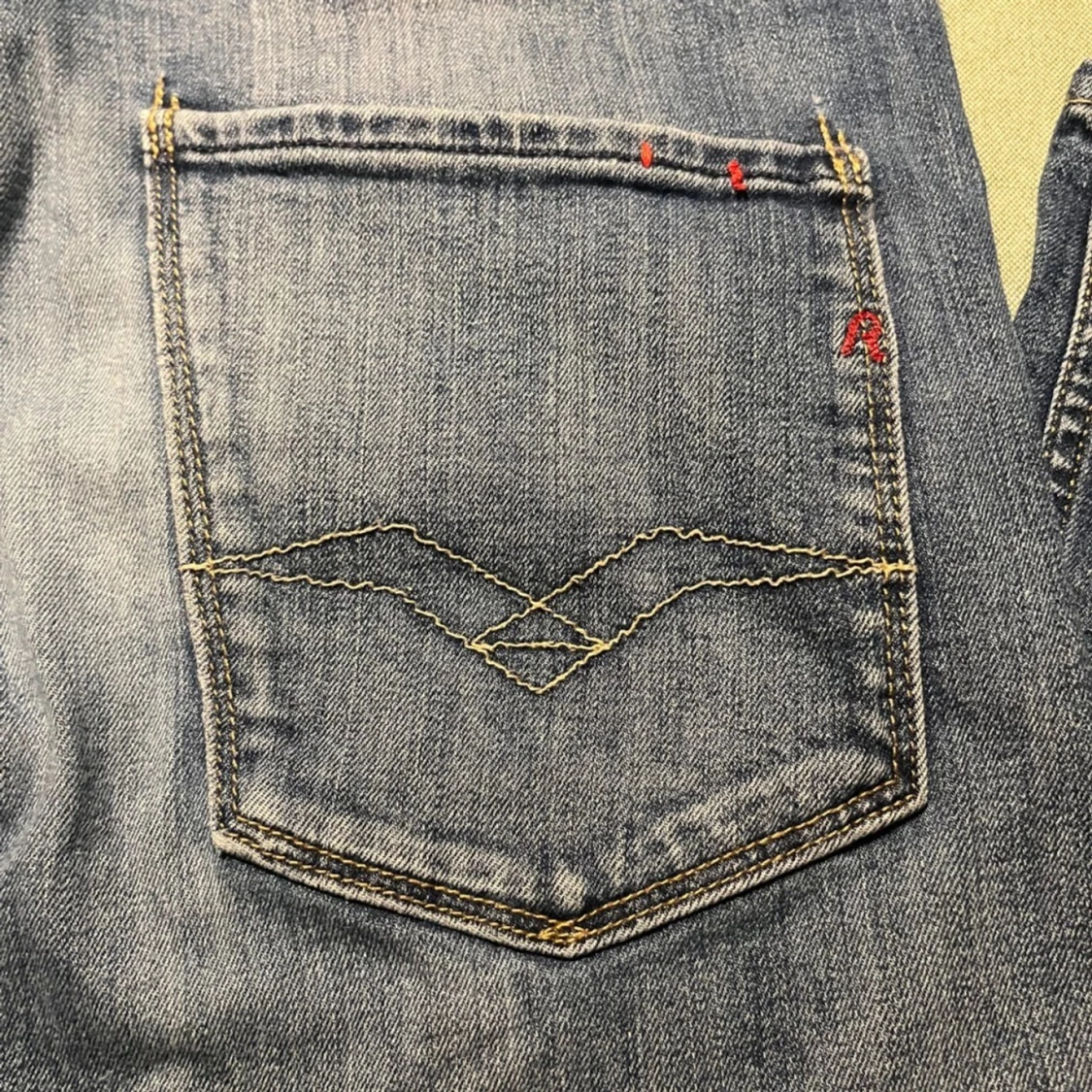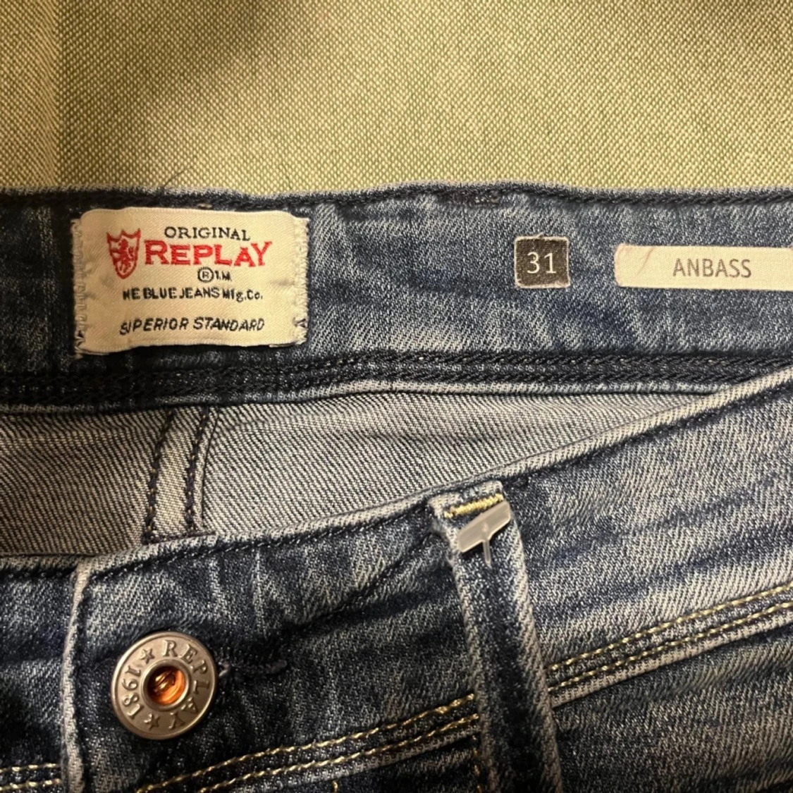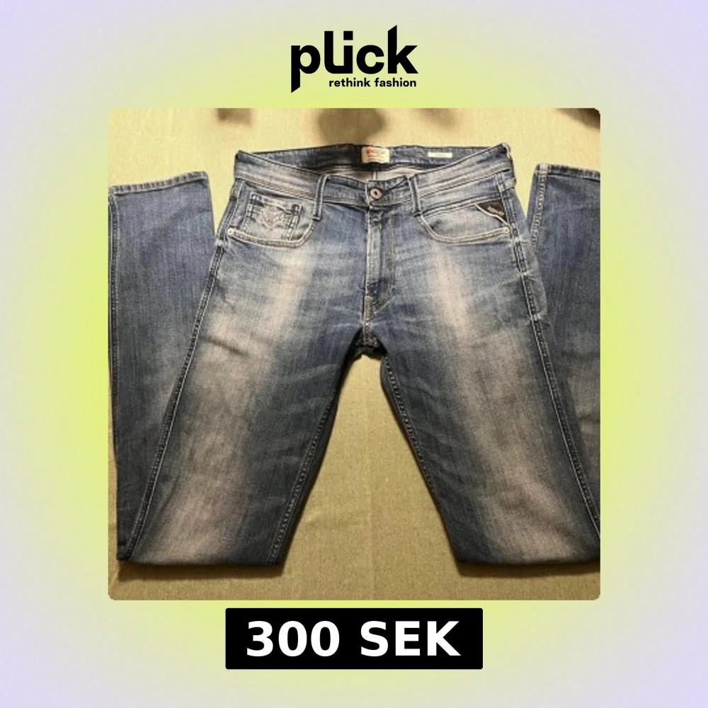 Snygga blå jeans från Replay, modell Anbass. De har en klassisk femficksdesign med dragkedja och knapp. Jeansen har en lätt tvättad look och är perfekta för en avslappnad stil.