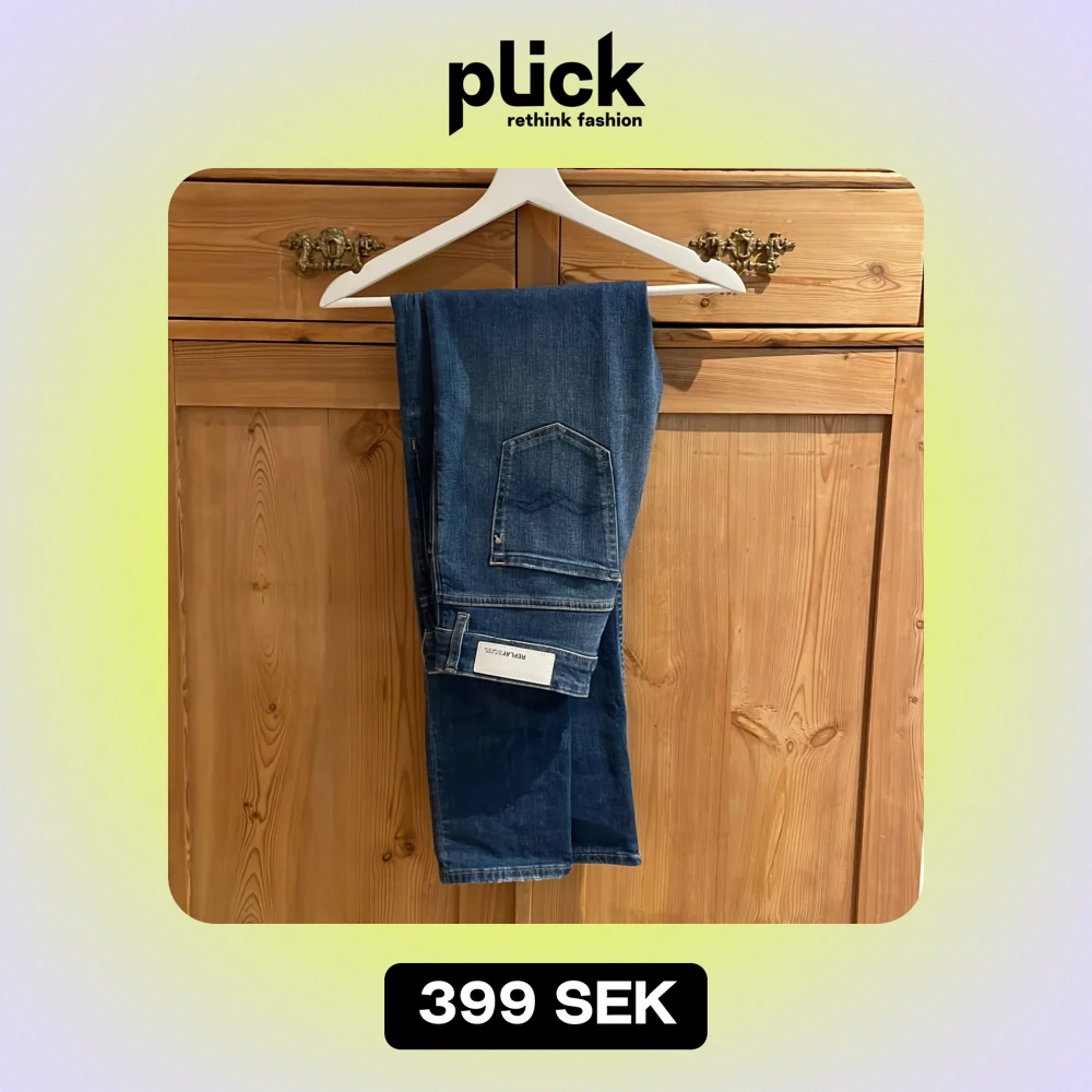 Säljer ett par snygga blå jeans från Replay. De har en klassisk femficksdesign med en knapp och dragkedja framtill. Jeansen har en lätt tvättad look som ger dem en cool och avslappnad stil. Perfekta för både vardag och fest storlek w26 L30