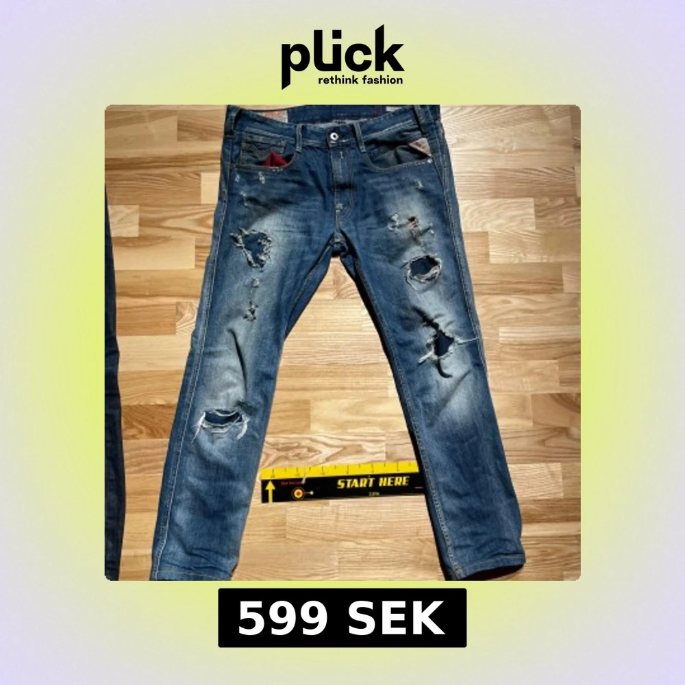 Säljer ett par blå Replay Anbass jeans med slitna detaljer och hål för en trendig look. De har en klassisk femficksdesign och knappgylf. Perfekta för en avslappnad stil. Modell anbass