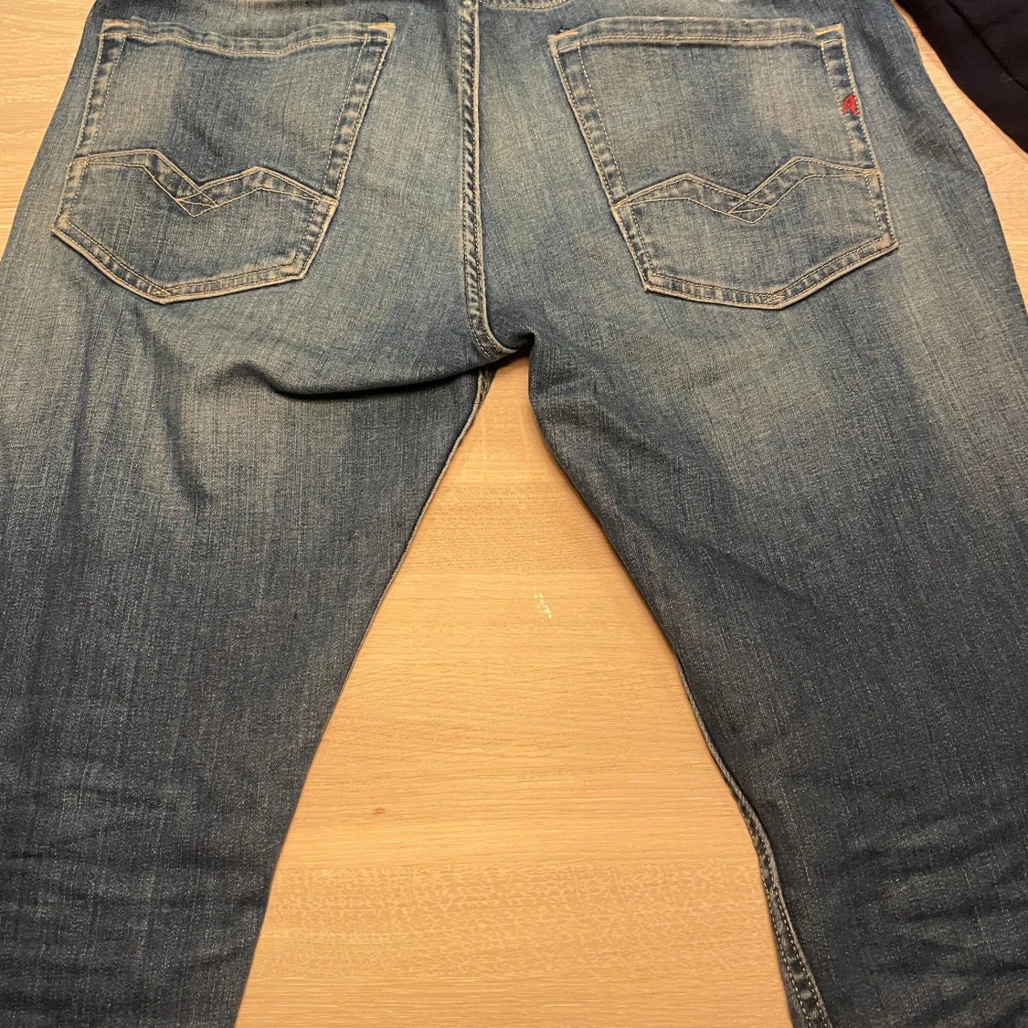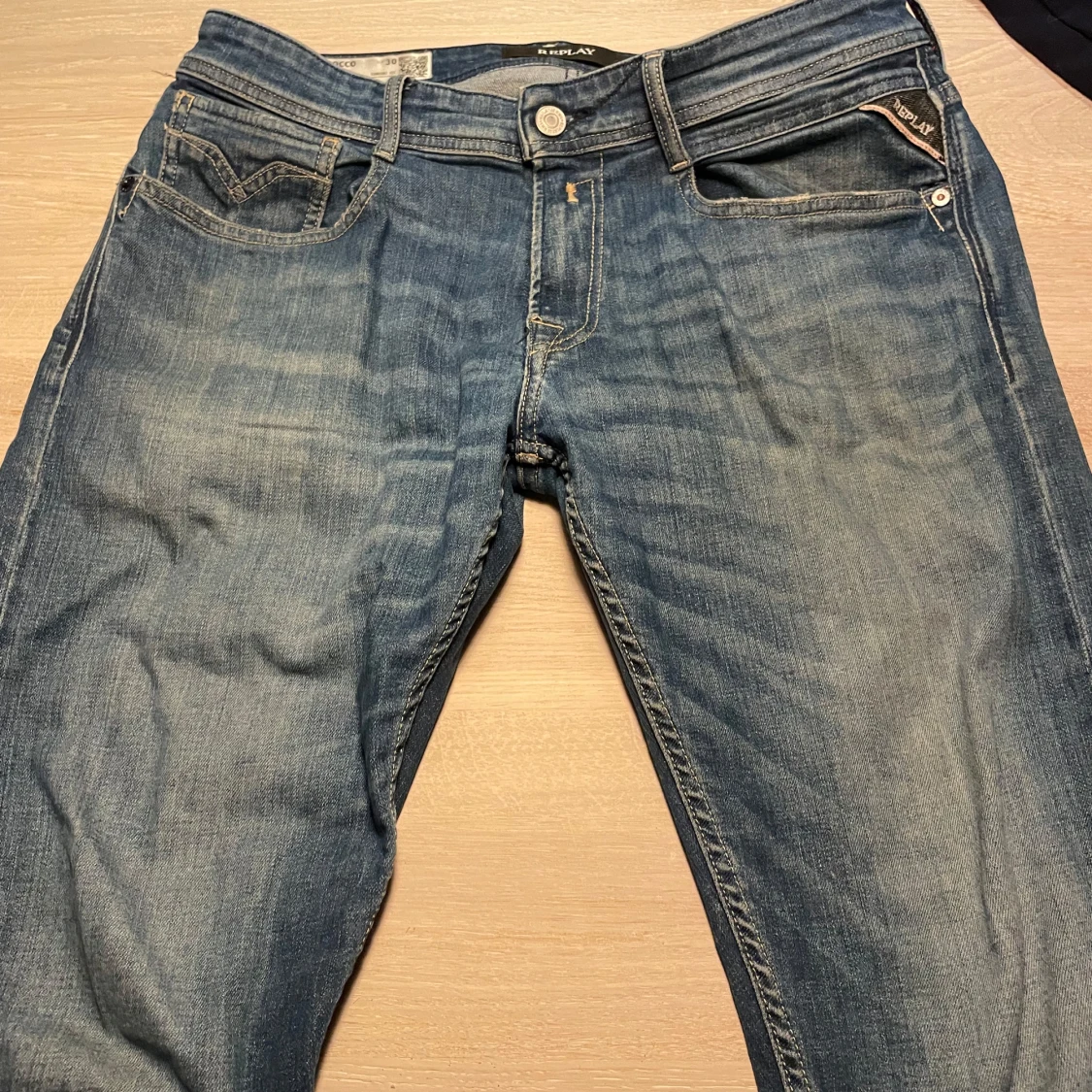 Snygga blå jeans från Replay med klassisk femficksdesign och knappgylf. De har en lätt tvättad look och är perfekta för en avslappnad stil. Märkesdetaljer syns på bakfickorna. Skick 7/10 modell Rocco storlek 30. Original pris är 1800. Pris kan diskuteras vid snabb affär💨