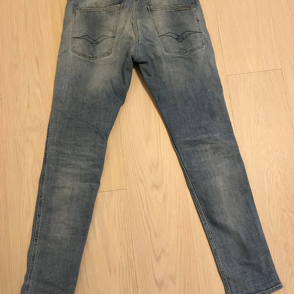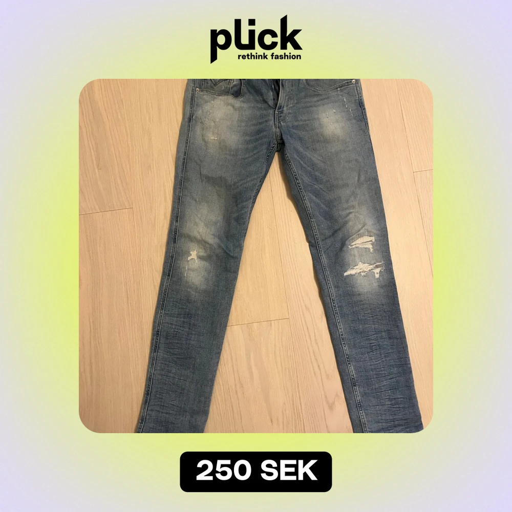 Säljer ett par snygga blå jeans från Replay i modellen Anbass. De har en slim passform och är i bra skick med coola slitningar på framsidan. Perfekta för en avslappnad stil och kan bäras året runt. Passar både till vardags och fest!