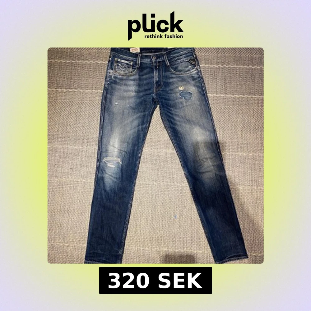 Snygga blå jeans från Replay med slitna detaljer och en cool dragkedja på bakfickan. Perfekta för en avslappnad stil. Skick: 9/10. Pris kan diskuteras vid snabb affär.