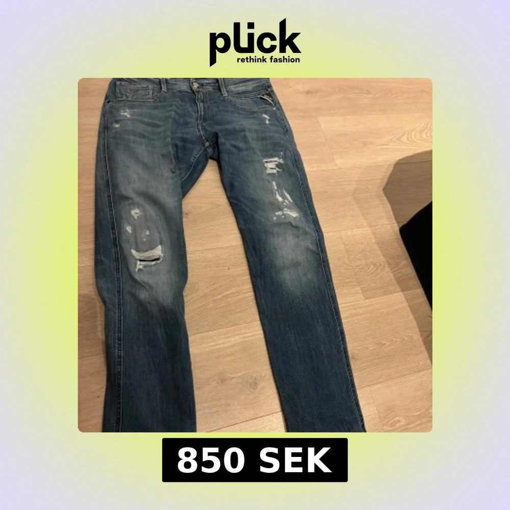 Säljer ett par blå Replay Anbass jeans med slitna detaljer. De är i jätte bra skick. Säljer dom eftersom de va lite för stor för mig.