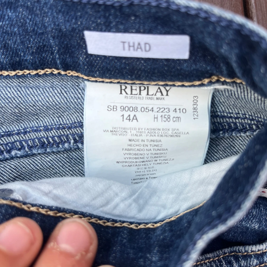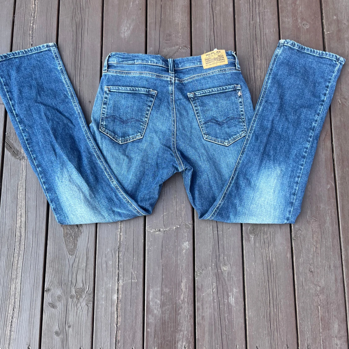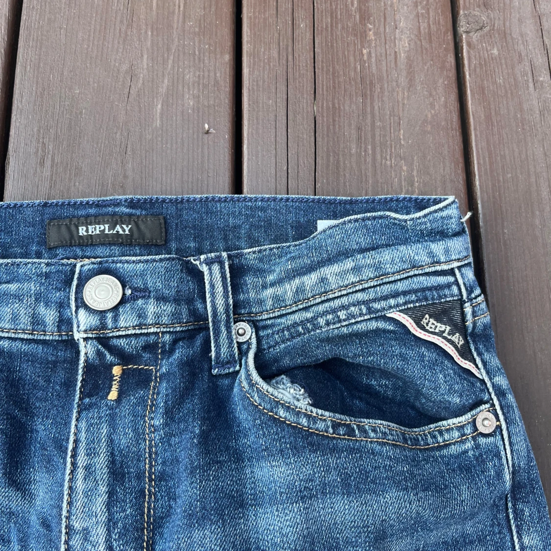 Säljer ett par klassiska blå jeans från Replay i rak passform. Jeansen har fem fickor, snygga slitningar och tydliga kontrastsömmar. Märkesdetaljer på fickan och bak. Perfekta för dig som gillar en tidlös denimlook.