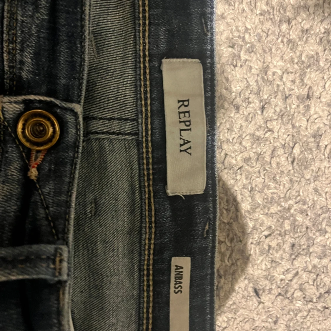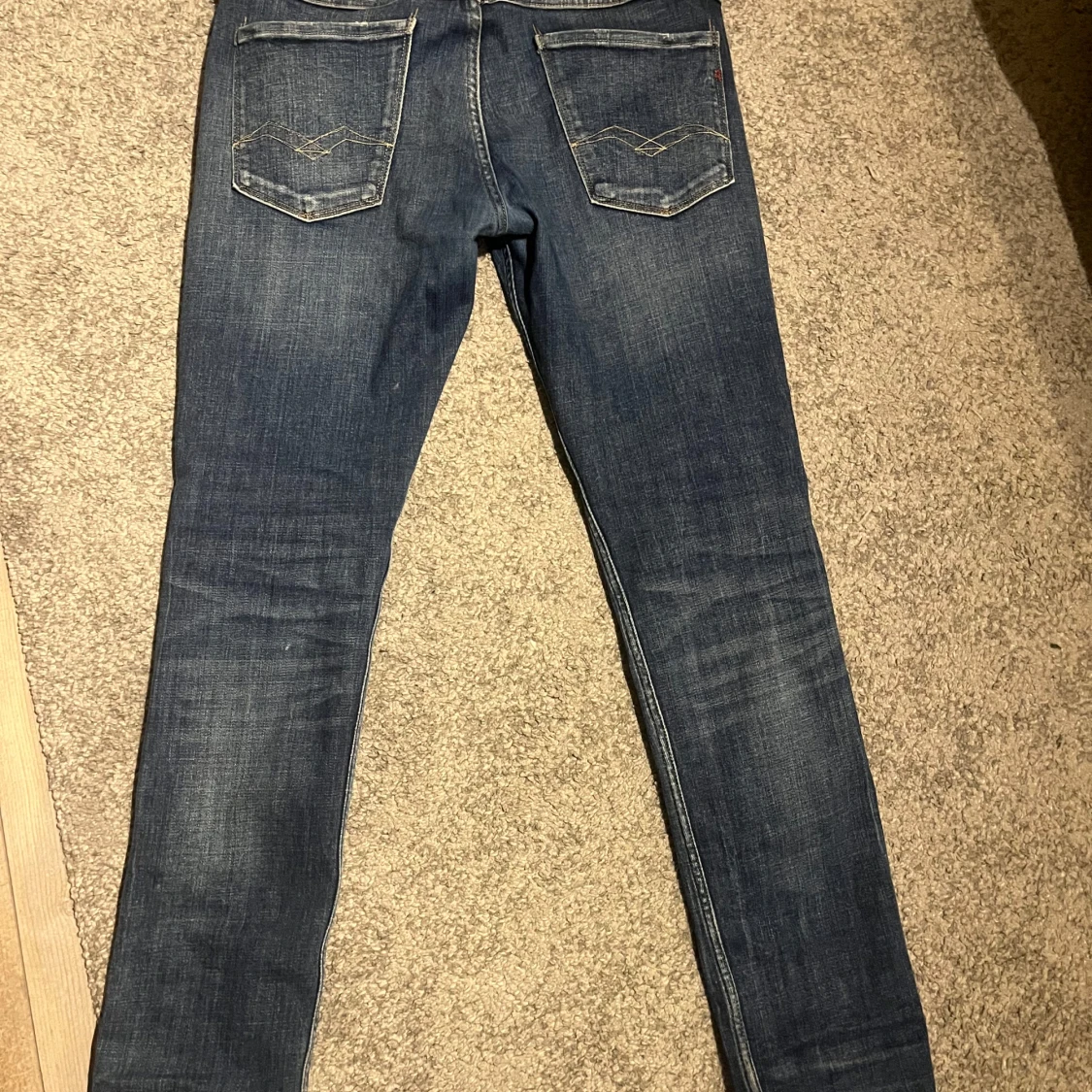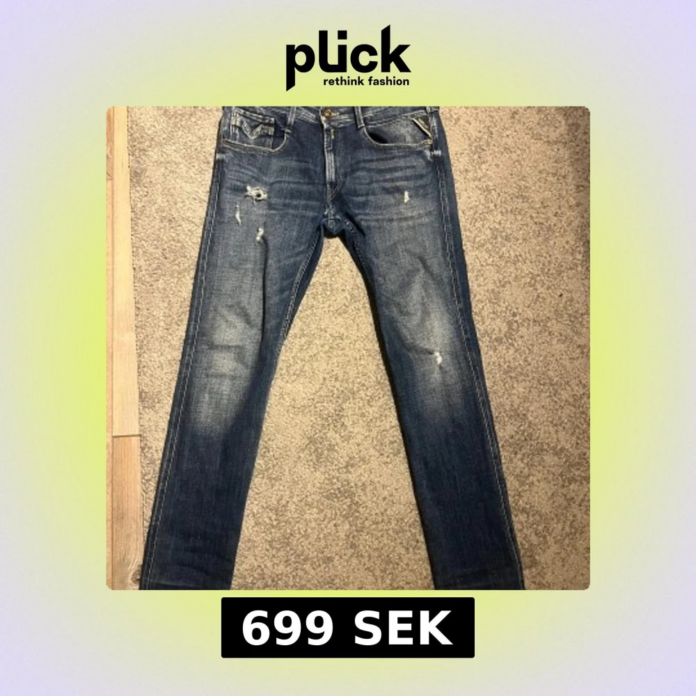 Säljer ett par snygga blå Replay Anbass jeans med slitna detaljer. Skick 9/10. Storlek 34/31