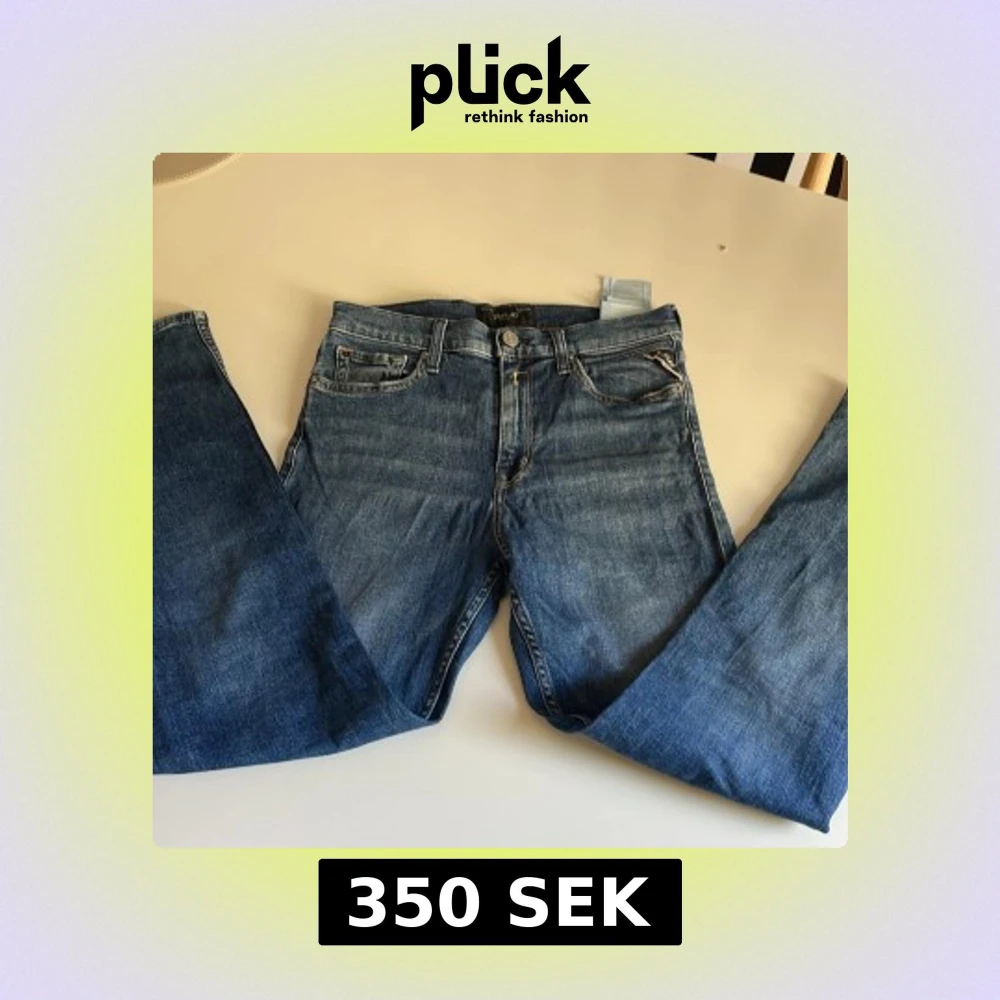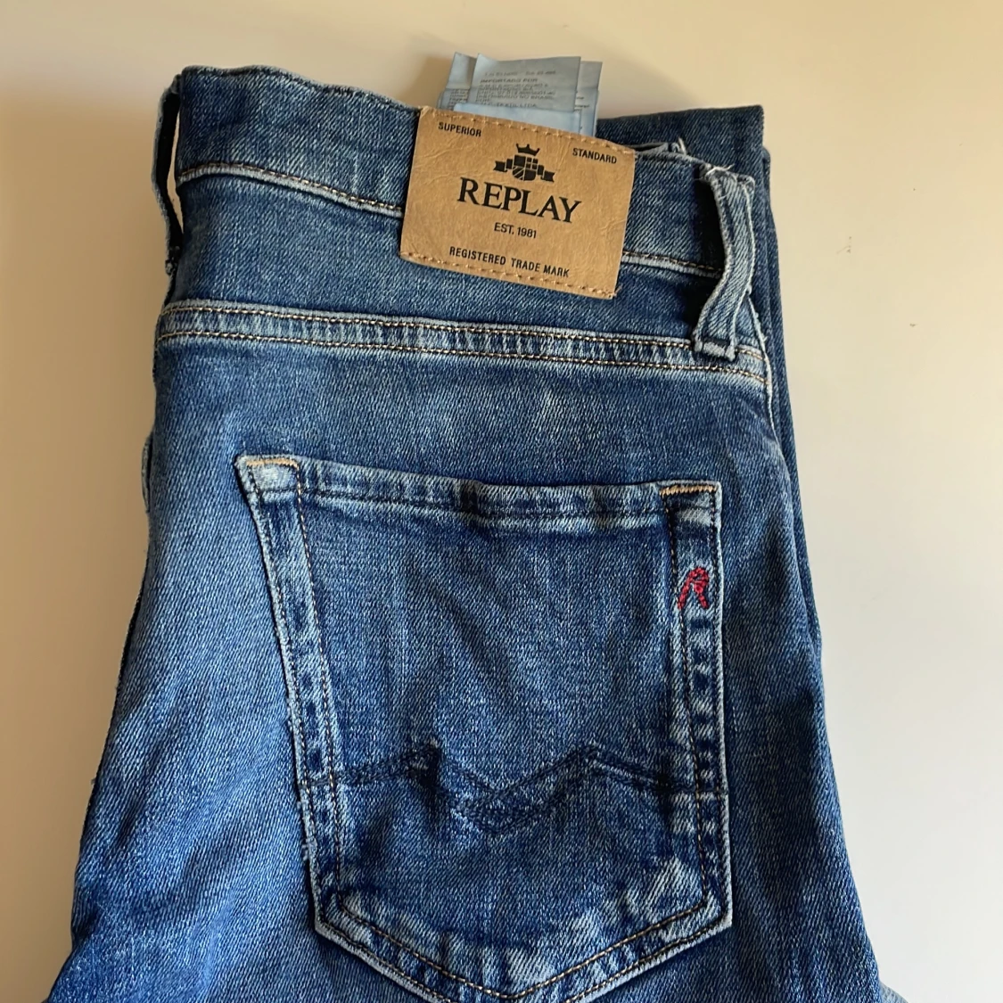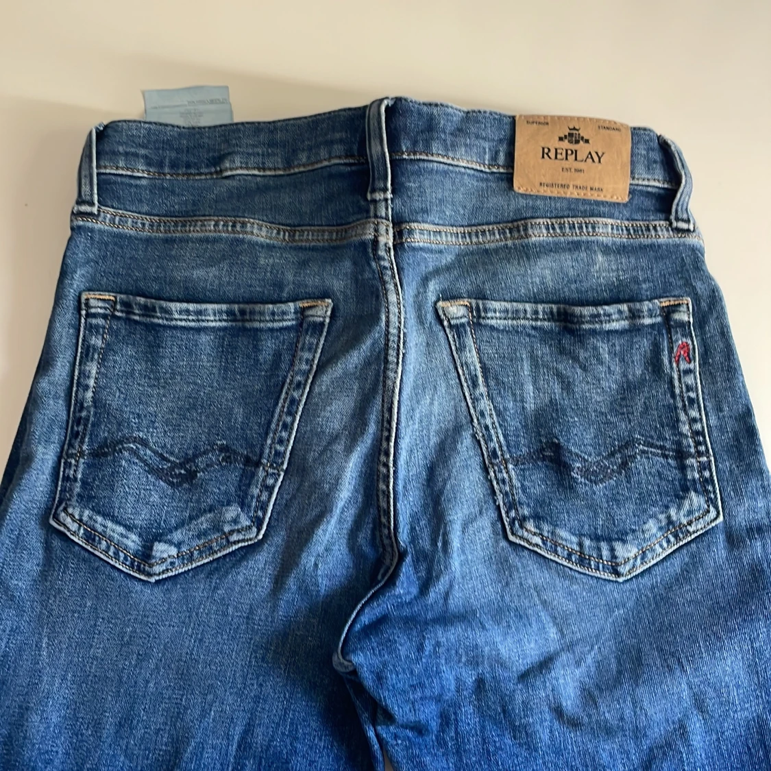 Säljer ett par klassiska blå jeans från Replay med raka ben och femficksdesign. Jeansen har snygga kontrastsömmar, läderpatch med Replay-logga bak och är tillverkade i slitstarkt denim. Perfekta för dig som gillar en tidlös och enkel stil.