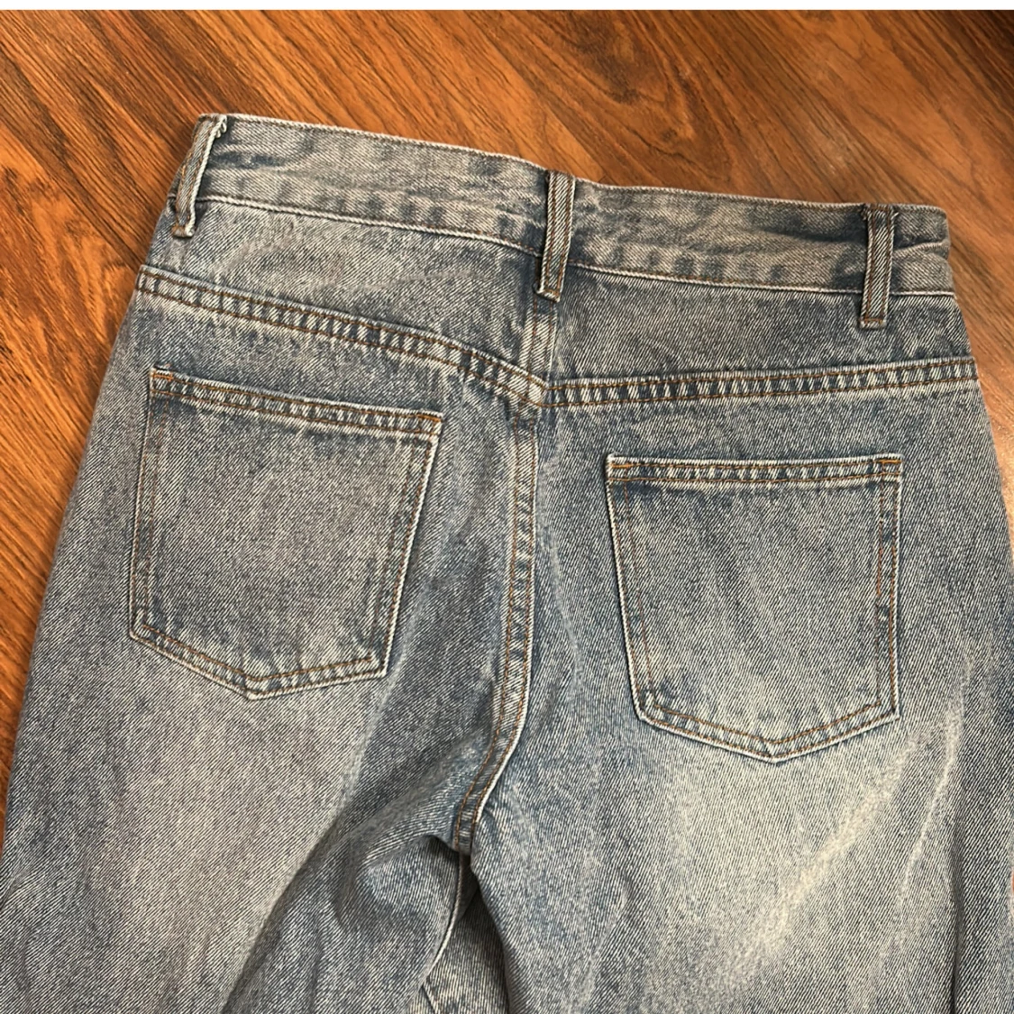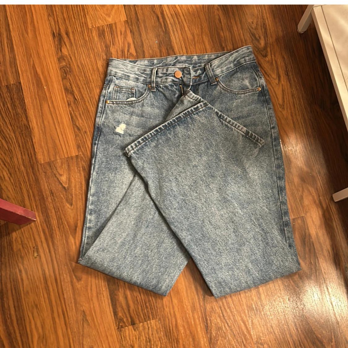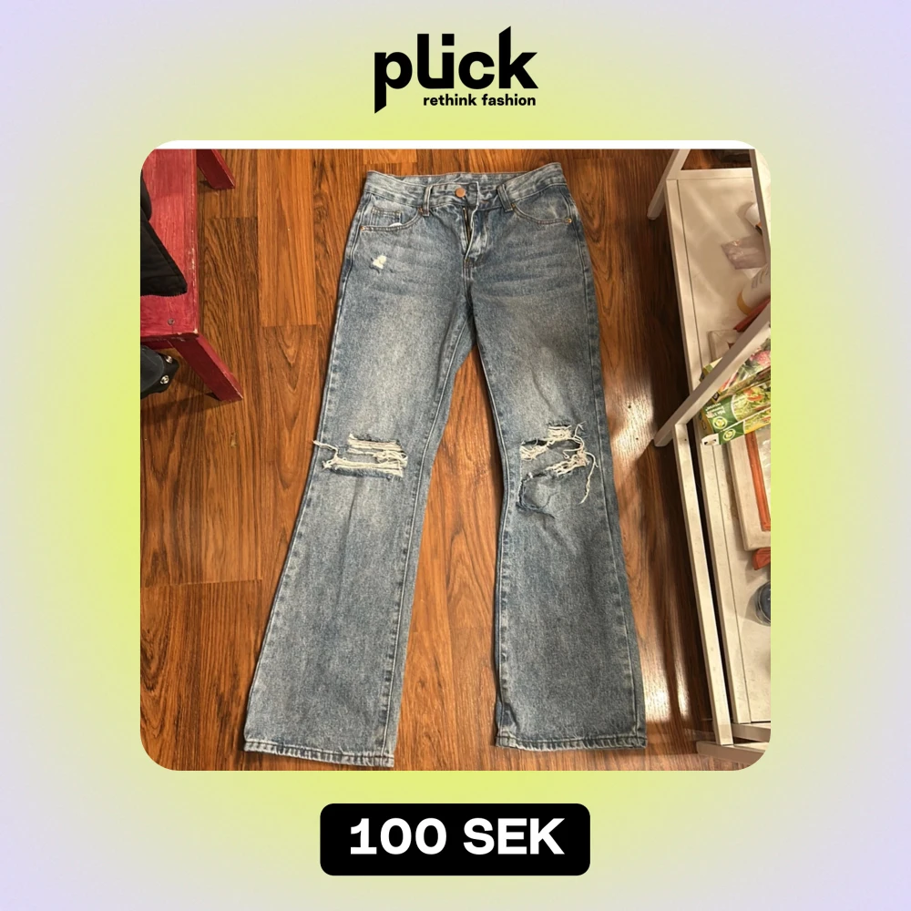 Säljer ett par blå jeans från Shein i storlek XS. De har en cool distressed look med slitningar på knäna och en bootcut-stil. Perfekta för en avslappnad vardagsstil. De är i bra skick och redo för en ny ägare!