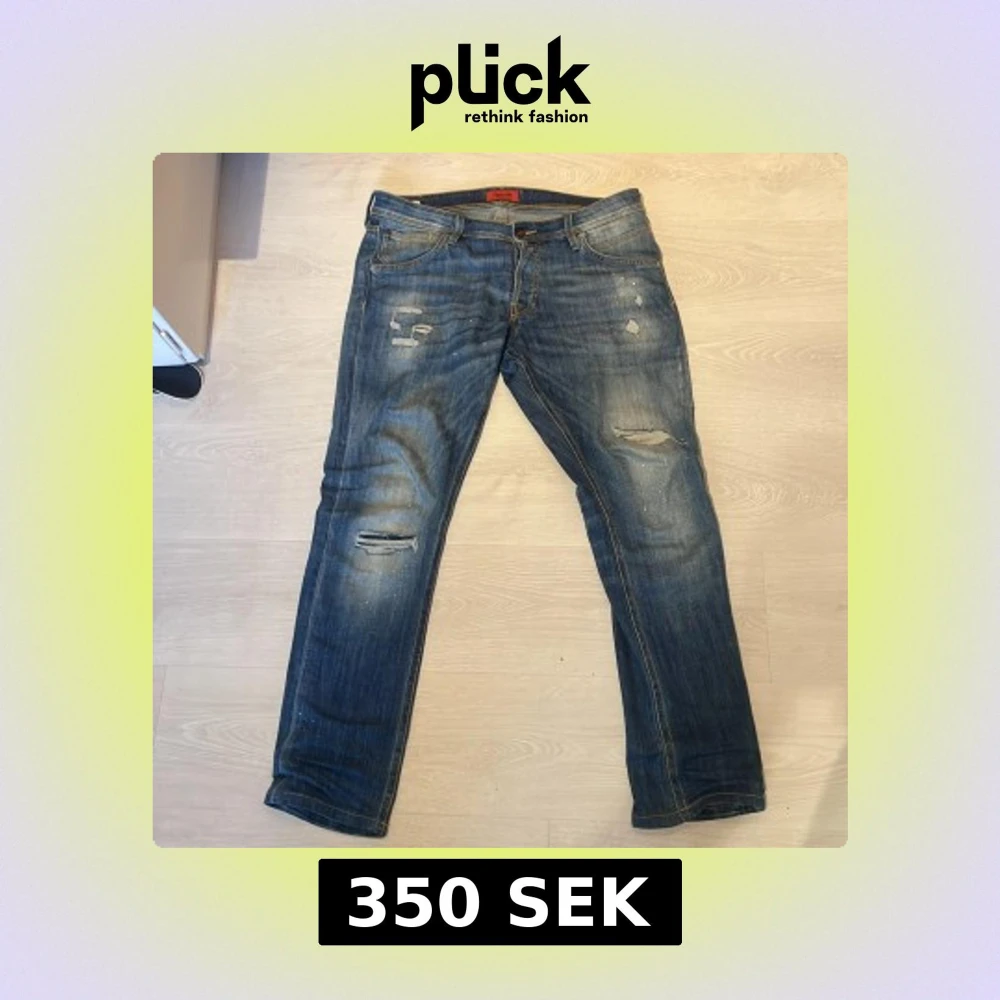 Säljer ett par blå jeans från Jack & Jones med slitna detaljer och små färgstänk. Klassisk femficksmodell med rak passform och snyggt tvättad look. Jeansen har normal midja och är tillverkade i vanligt jeans matrial för en skön känsla.
