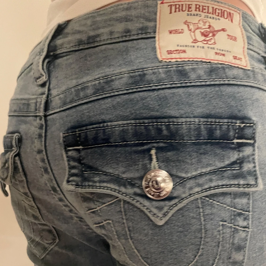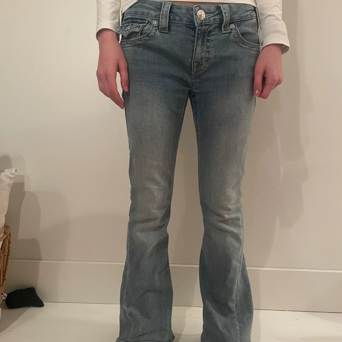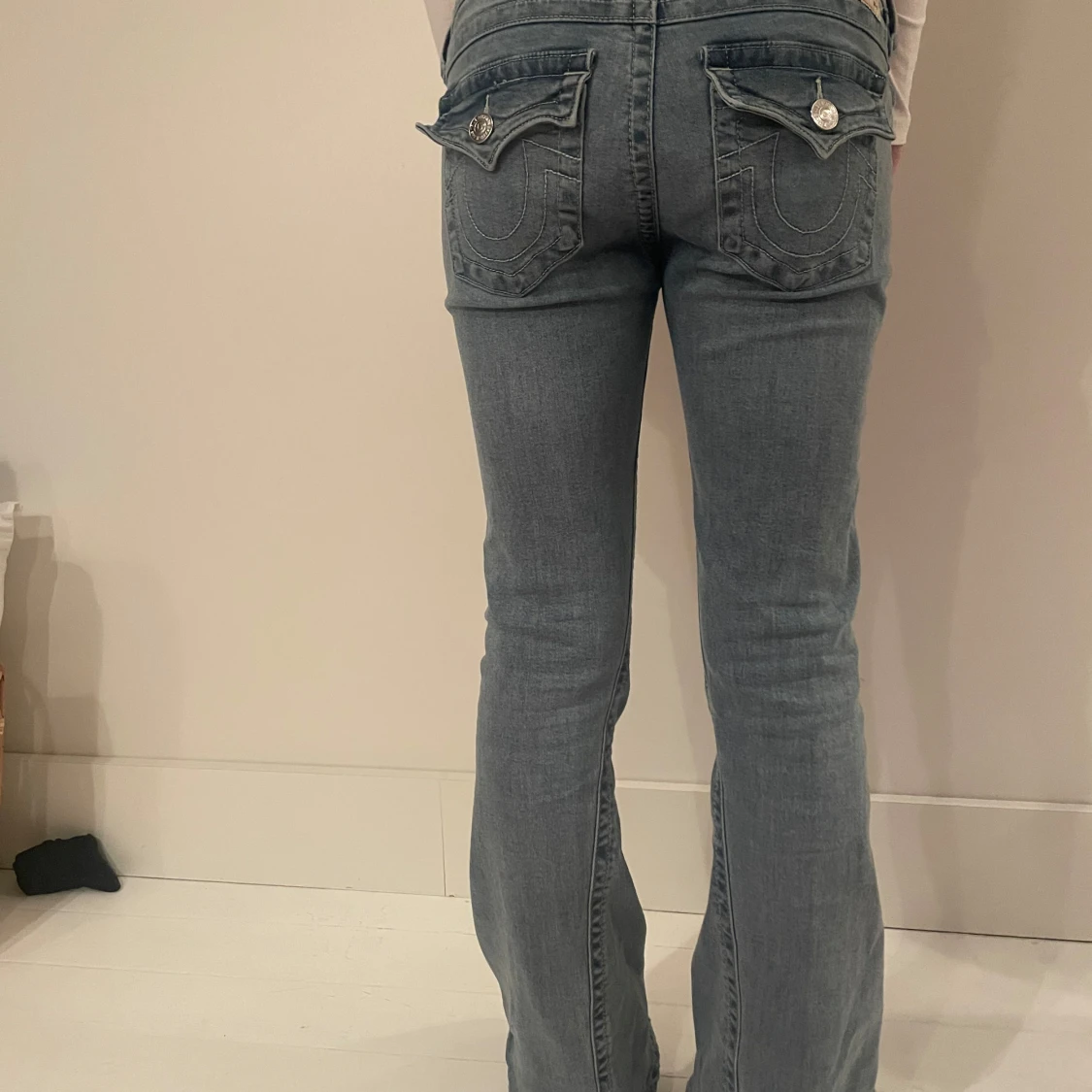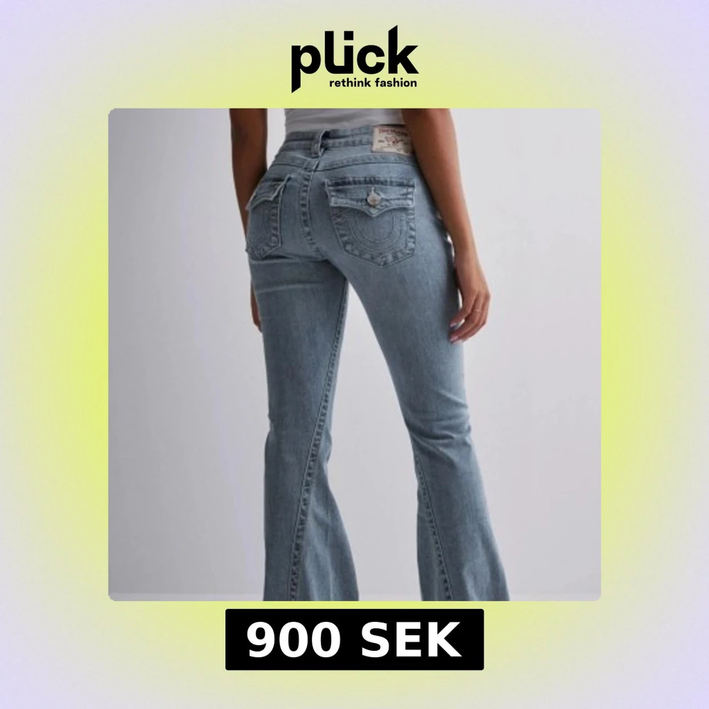 Snygga blå jeans från True Religion med bootcut och låg midja. De har dekorativa bakfickor med knappar. Dem är i modellen ”joey” och är i storlek 27. Säljer pga att de är alldeles för stora (jag har 34 i jeans i vanliga fall) Dem är använda två gånger och är i perfekt skick! Nypris: 1 299kr☺️