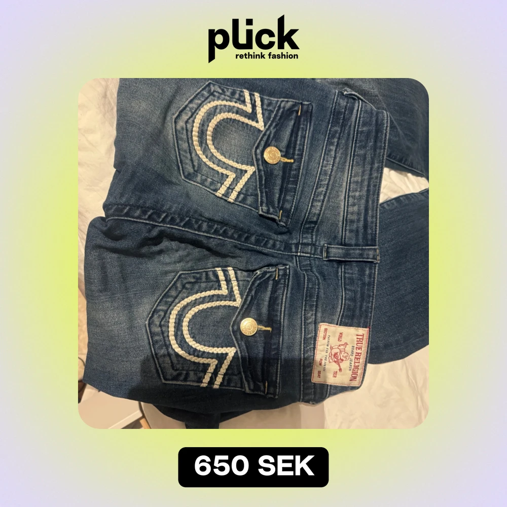 Säljer ett par snygga blå bootcut jeans från True Religion. Mid-waist och storlek 27. Passar 36, 38. De har coola broderade detaljer på bakfickorna och en klassisk femficksdesign. Jeansen är i bra skick dock har en knapp gått av men jag har den!