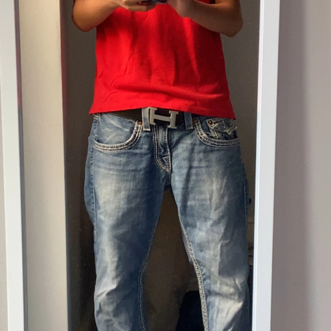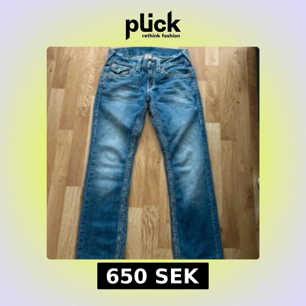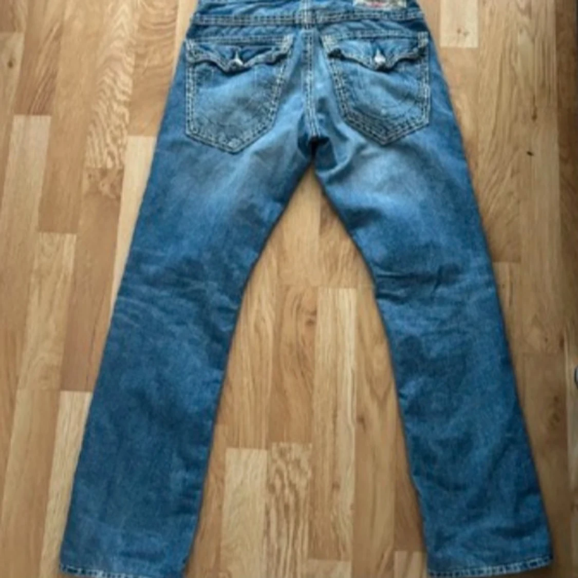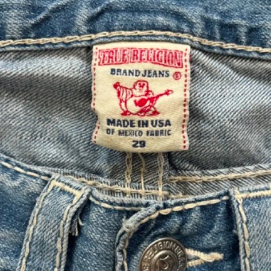 Snygga blå jeans från True Religion med klassisk femficksdesign och kontrastsömmar. Jeansen har en rak passform och är tillverkade i USA av mexikanskt tyg. Perfekta för en avslappnad stil.