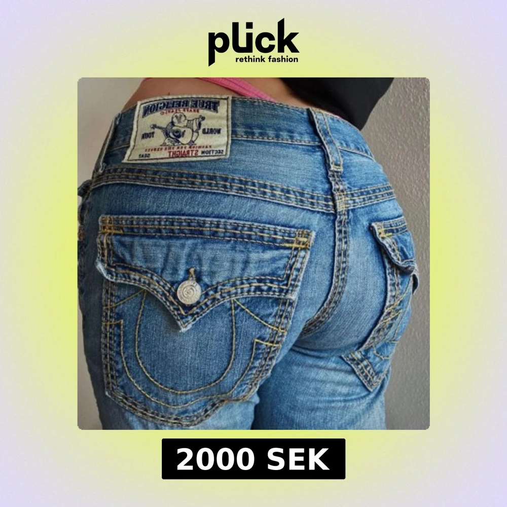 Säljer ett par snygga blå jeans från True Religion med ikoniska bakfickor och kontrastsömmar. Jeansen har en straight passform och är perfekta för en avslappnad stil. Märkeslappen syns tydligt på baksidan.