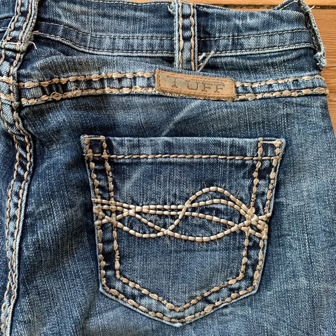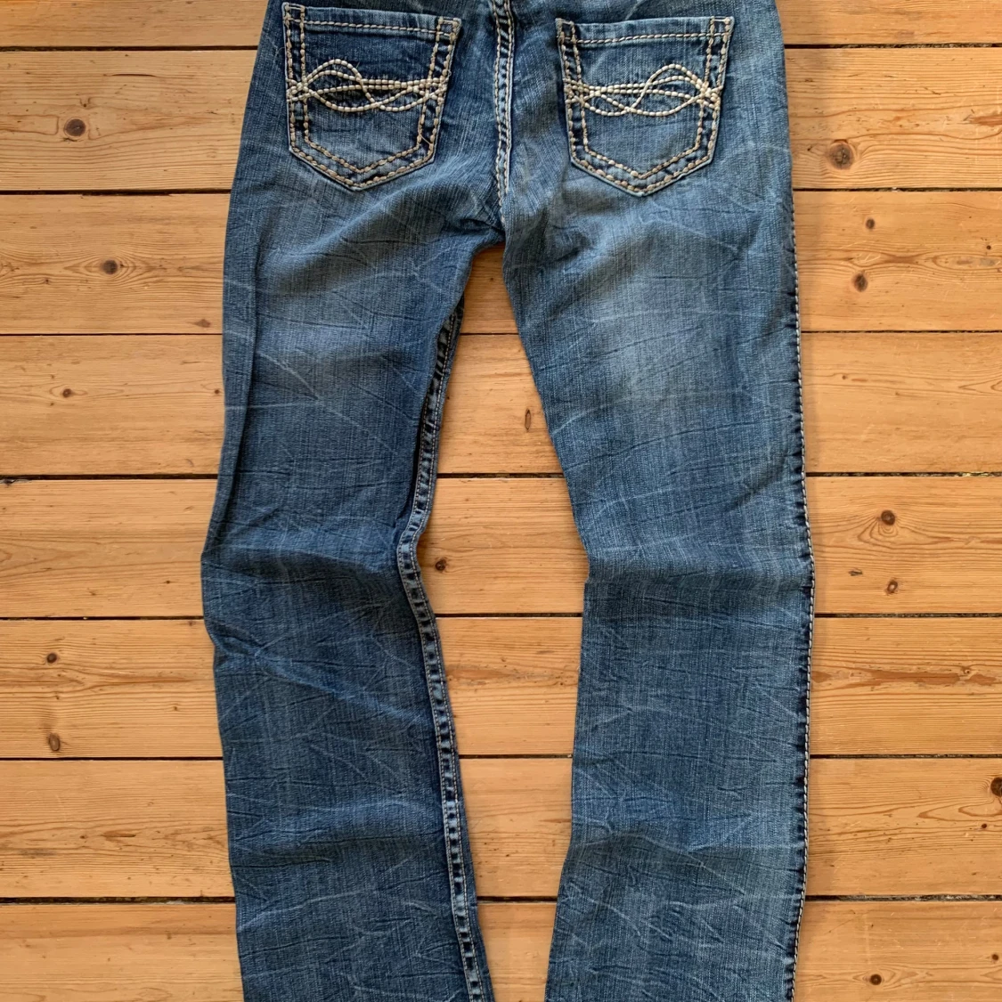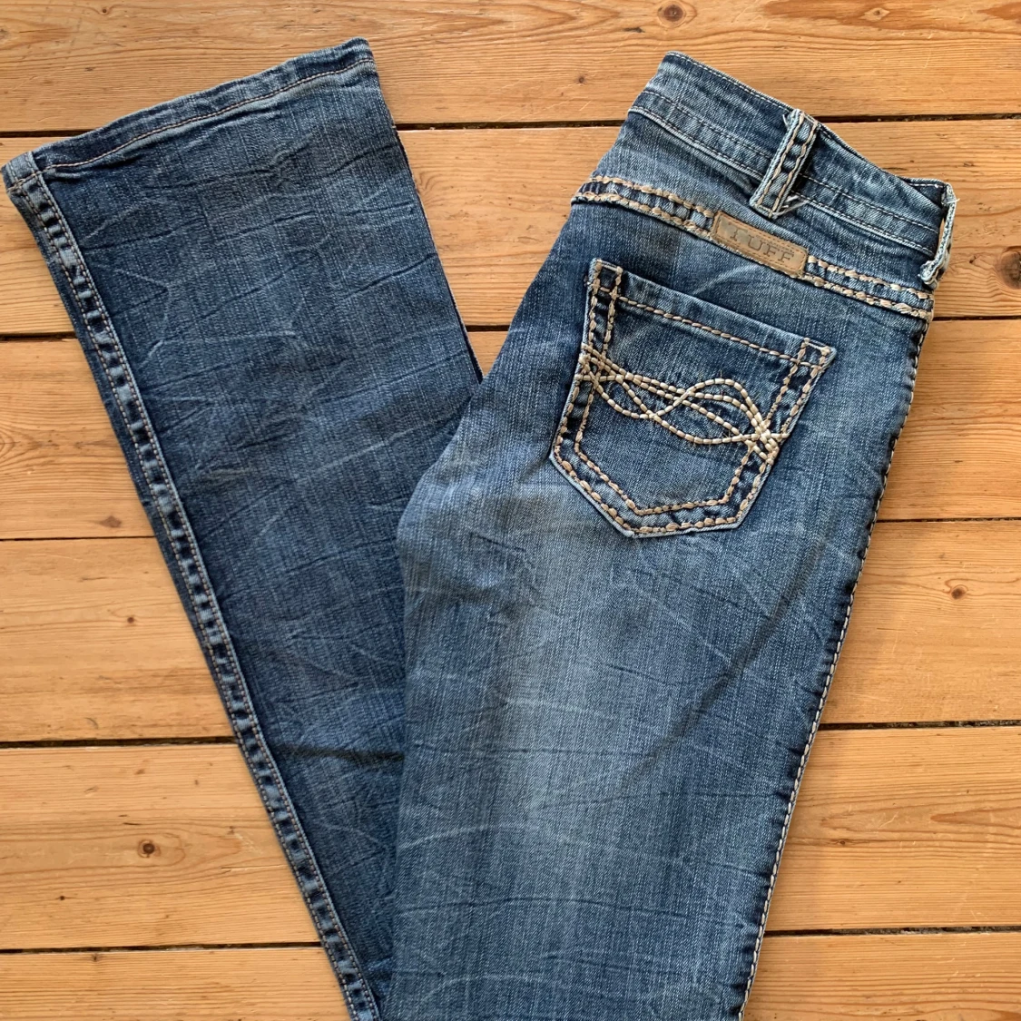 Snygga blå jeans från Tuff Co. med kontrasterande grova sömmar och broderi på bakfickan. Klassisk femficksmodell med raka ben och coola detaljer längs fickor och midja. Perfekta för dig som gillar en unik och avslappnad stil. Storlek W28 L32