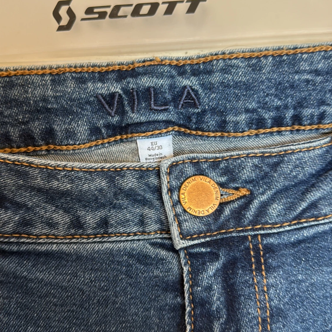 Snygga blå jeans från Vila med klassisk femficksdesign, De har en rak passform och är perfekta för en avslappnad stil. Jeansen har en hög midja och är tillverkade i ett slitstarkt denimtyg.