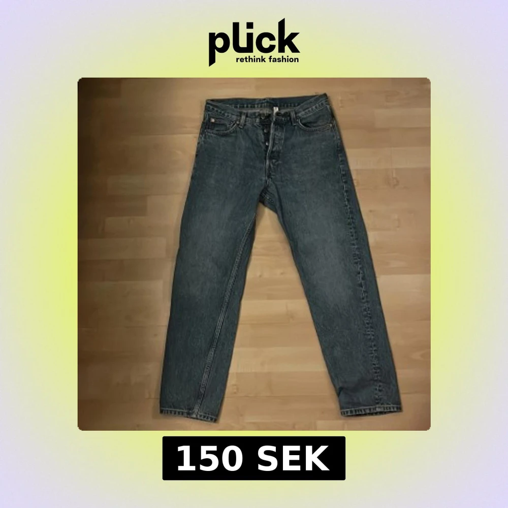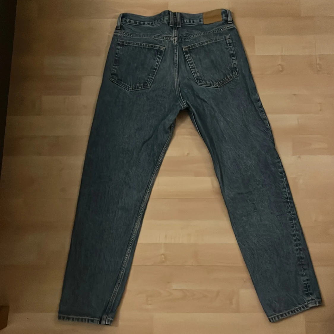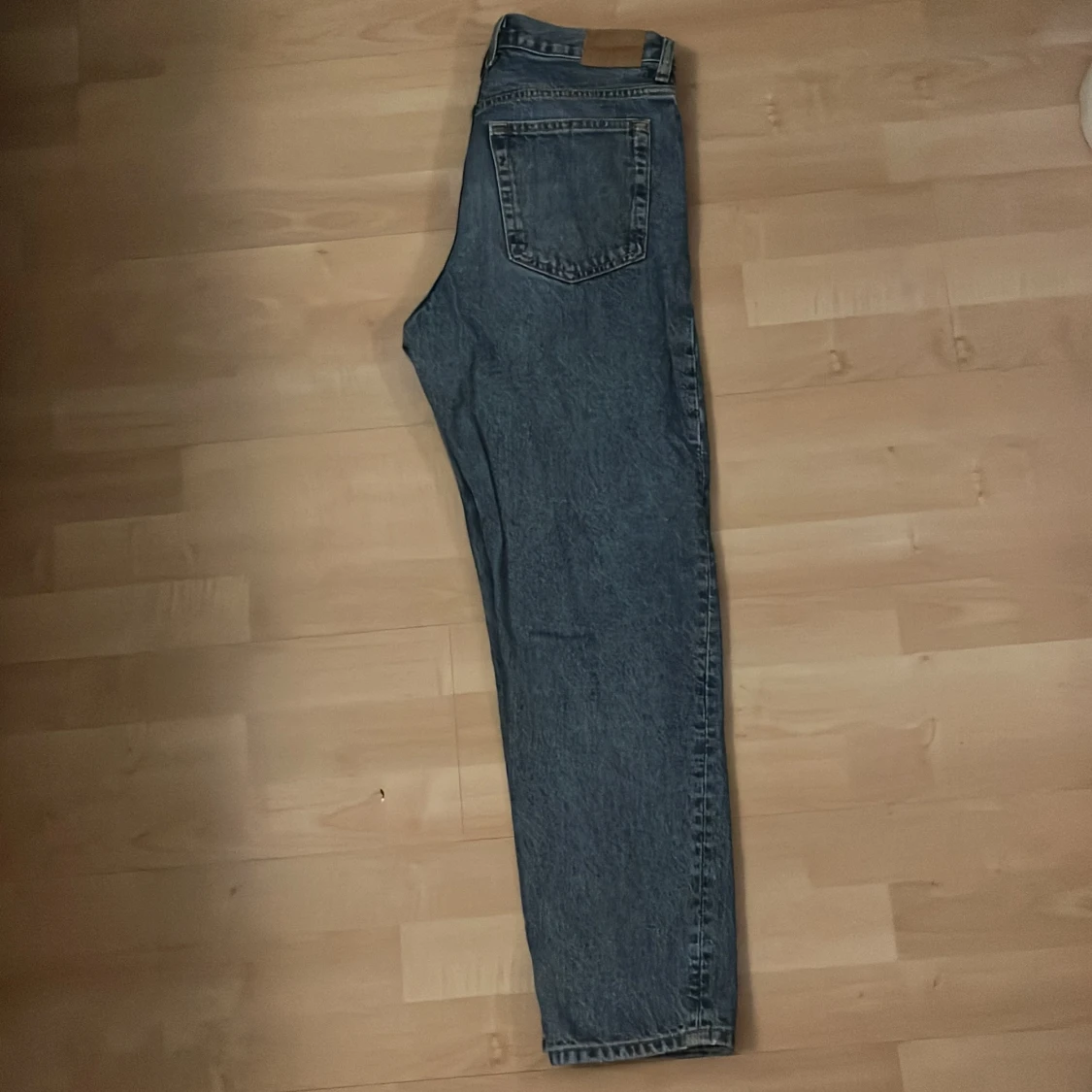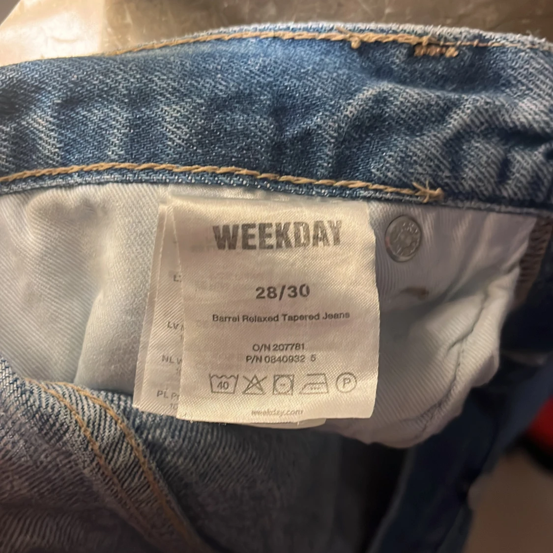 Säljer ett par blå jeans från Weekday i modellen Barrel Relaxed Tapered. De har en avslappnad passform med avsmalnande ben och klassisk femficksdesign. Perfekta för en stilren och bekväm look.