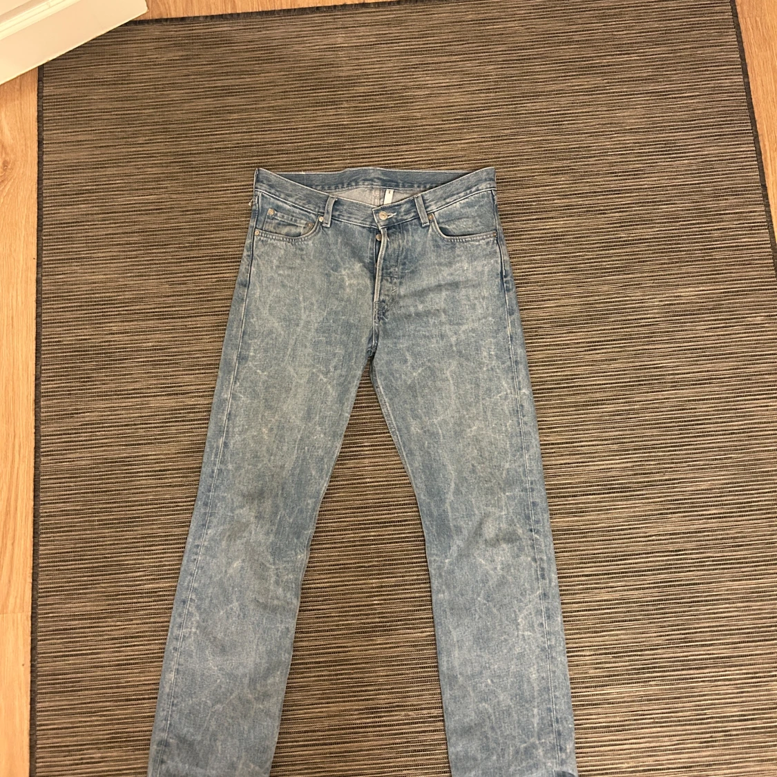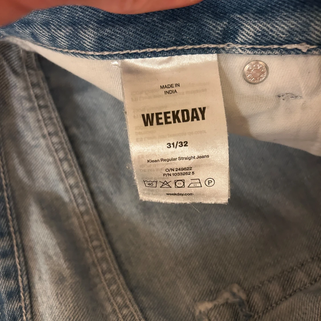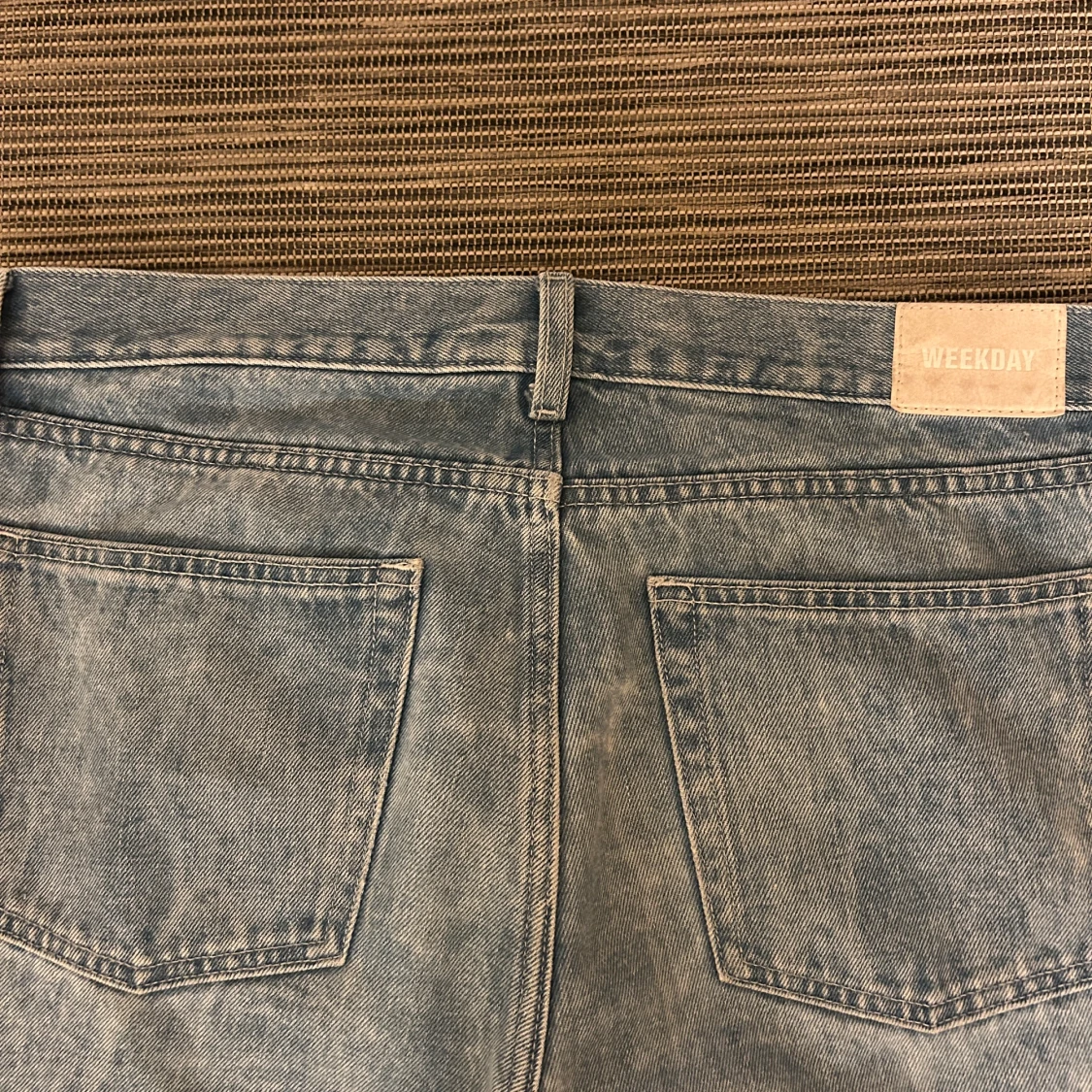 Säljer ett par blå jeans från Weekday med unik tvätt, modell Klean. De har en straight passform. Perfekta för en avslappnad men även stilren look.