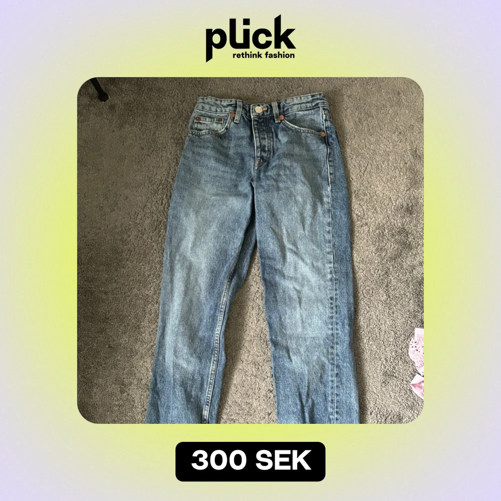 Säljer ett par klassiska blå jeans från Zara i storlek 32. De har en snygg, vintage look med fem fickor och knappgylf. De är mellanmidjade och sitter väldigt snyggt på!! Kontakta för mer💗