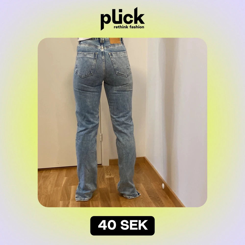 Säljer ett par snygga blå jeans från Zara i storlek 32. De har en cool distressed look med slitningar och är högmidjade för en bekväm passform. Perfekta för en avslappnad stil och kan matchas med allt från sneakers till klackar.