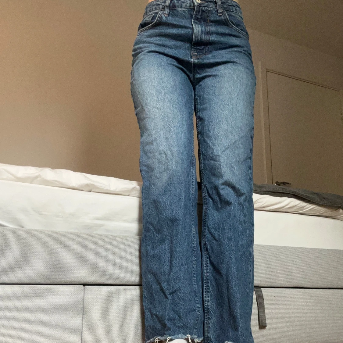 Snygga blå jeans från Zara med medelhög midja och en avslappnad straight-stil. Perfekta för en trendig look med en bekväm passform. Är en del av Zara Basic Collection. Säljer då de inte används längre.