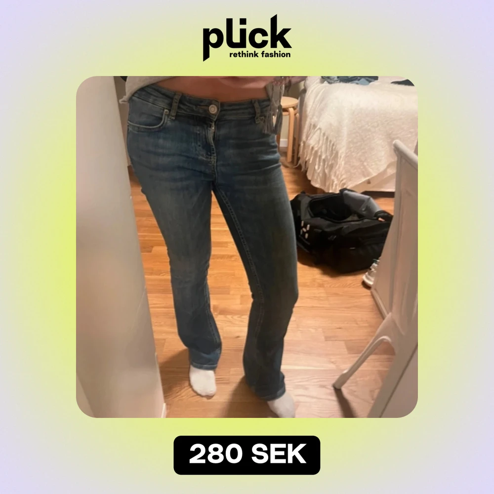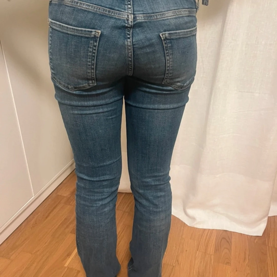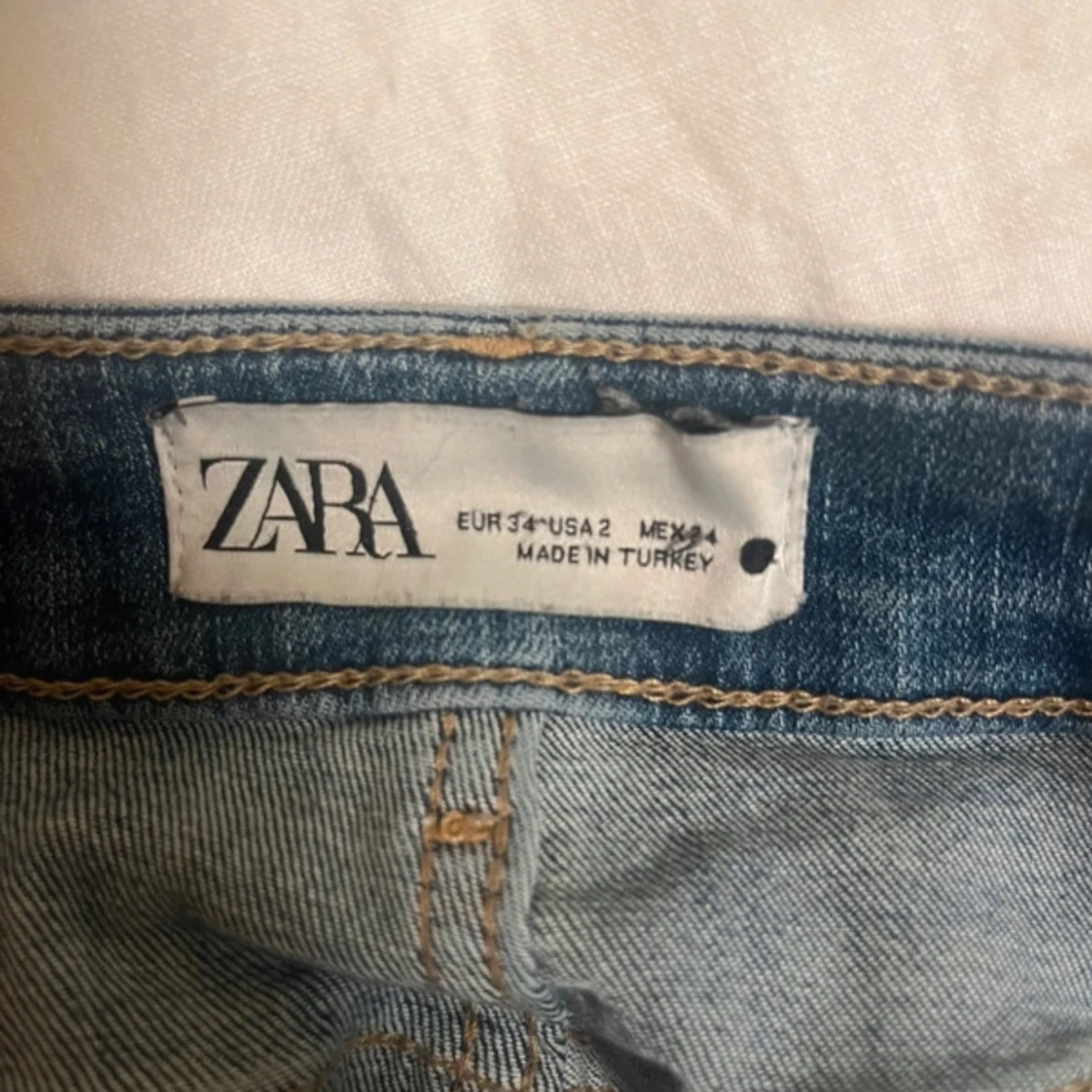 Säljer ett par snygga blå jeans från Zara i storlek 34. De är i bra skick. Perfekta för vardagsbruk med en bekväm passform. Lågmidjade