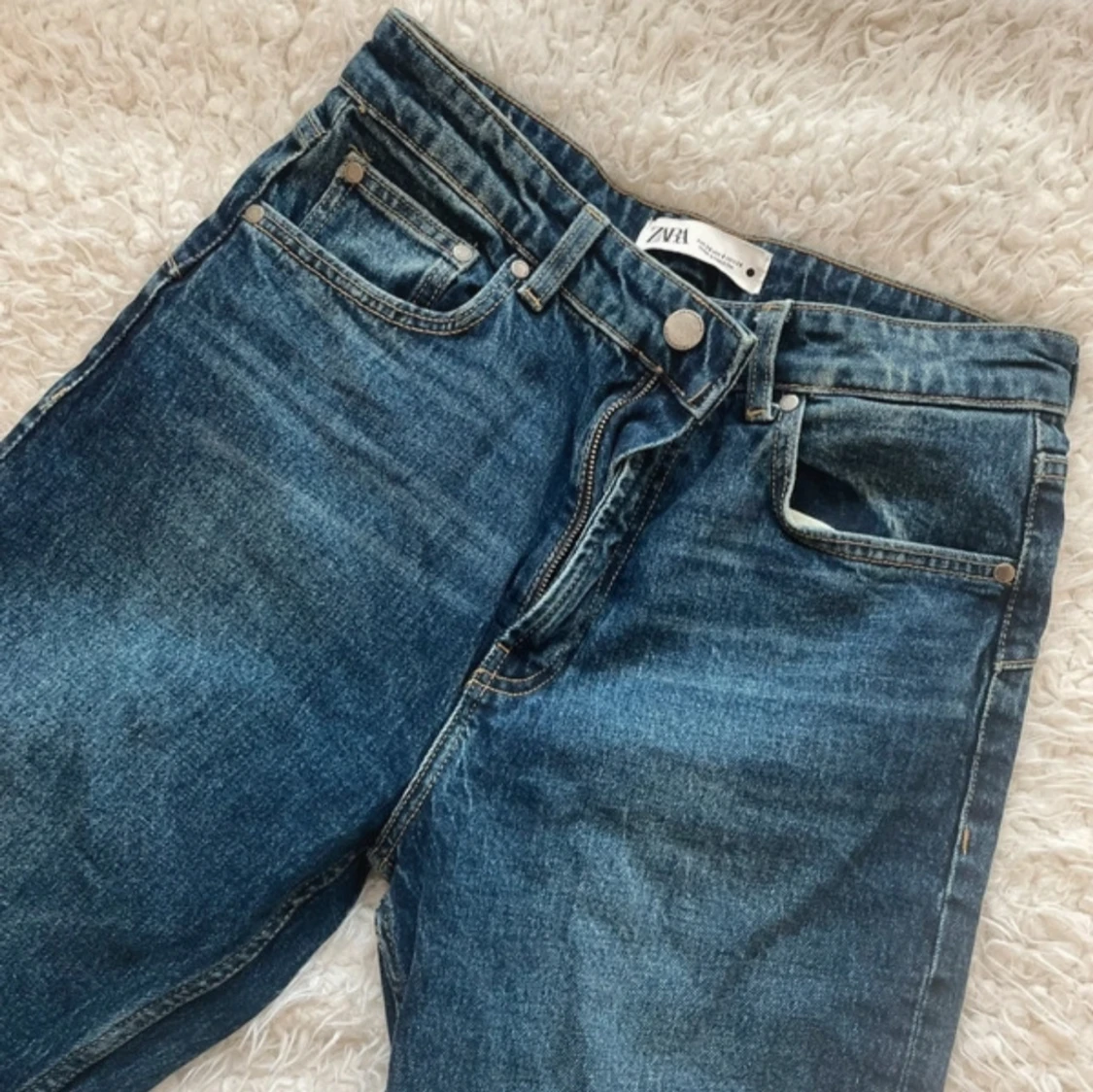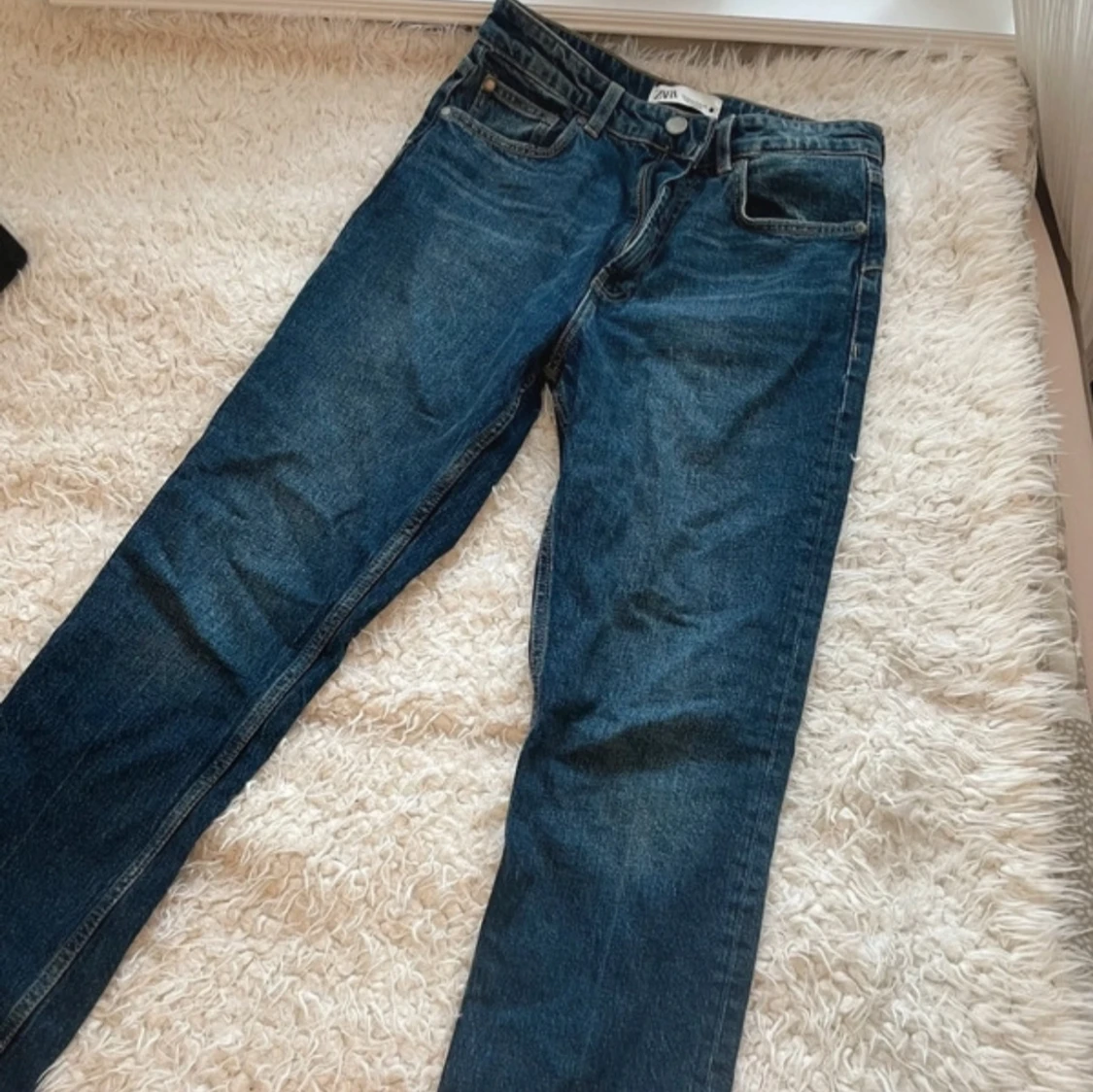 Snygga blå jeans från Zara med klassisk femficksdesign. De har en rak passform och är tillverkade i ett slitstarkt denimtyg. Perfekta för en avslappnad stil. Helt nya oanvända storlek 38