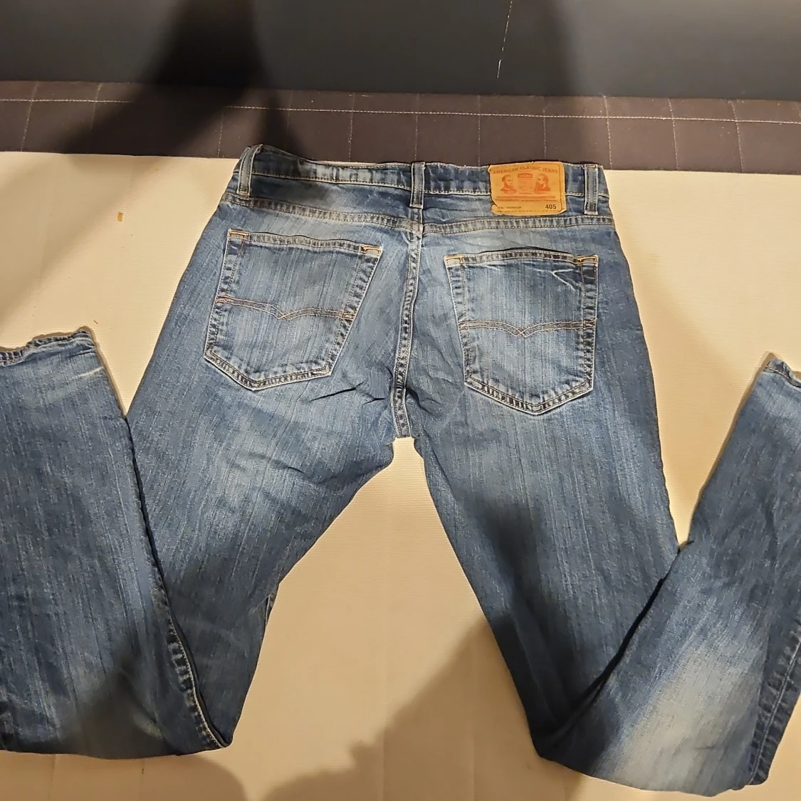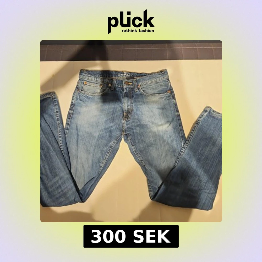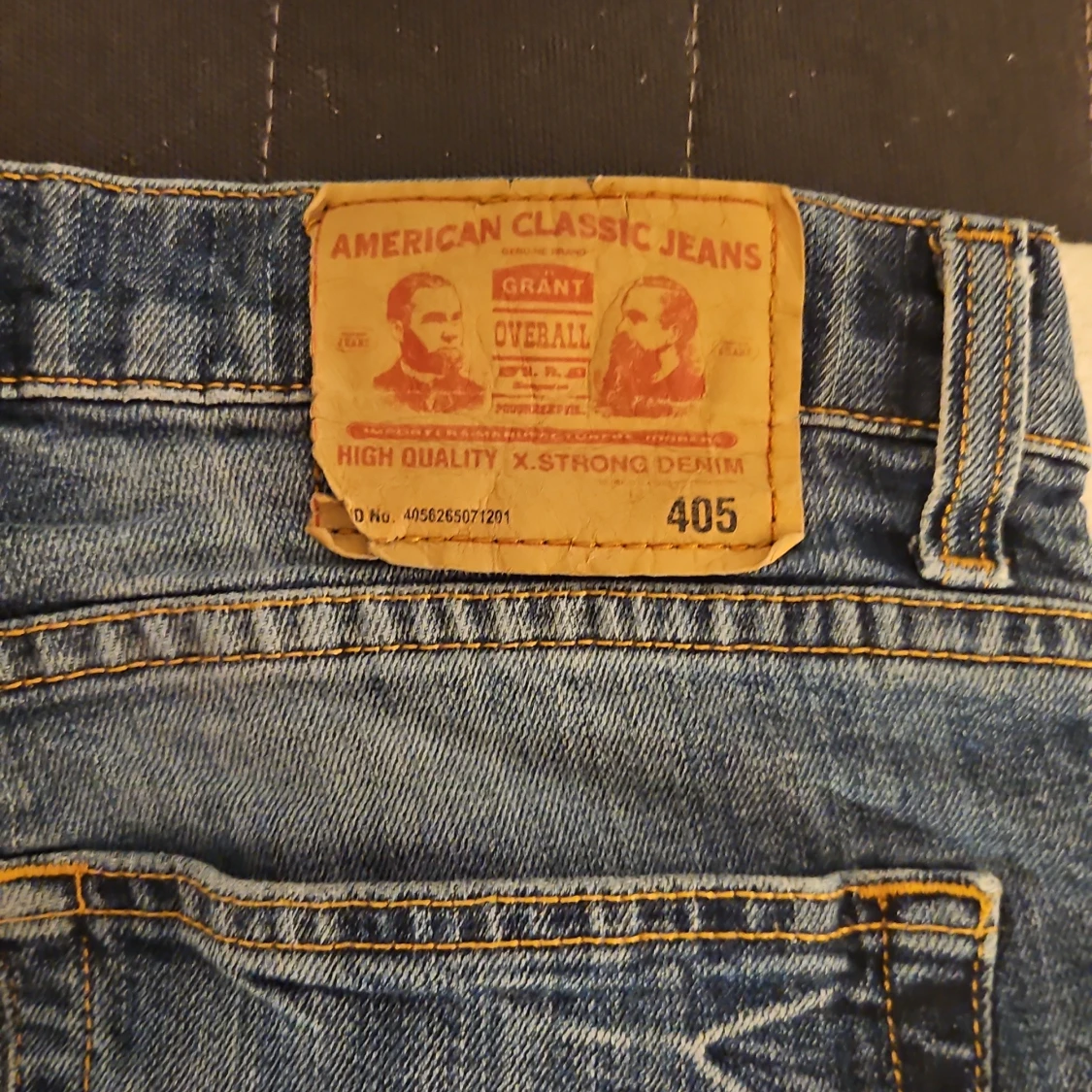 Säljer ett par klassiska blå jeans från Grant, modell 405. Jeansen har fem fickor, snygga kontrastsömmar och en läderpatch bak i midjan. Passformen är rak och materialet är slitstark denim. Perfekt för dig som gillar tidlös stil och vill ha jeans med lite längre ben.