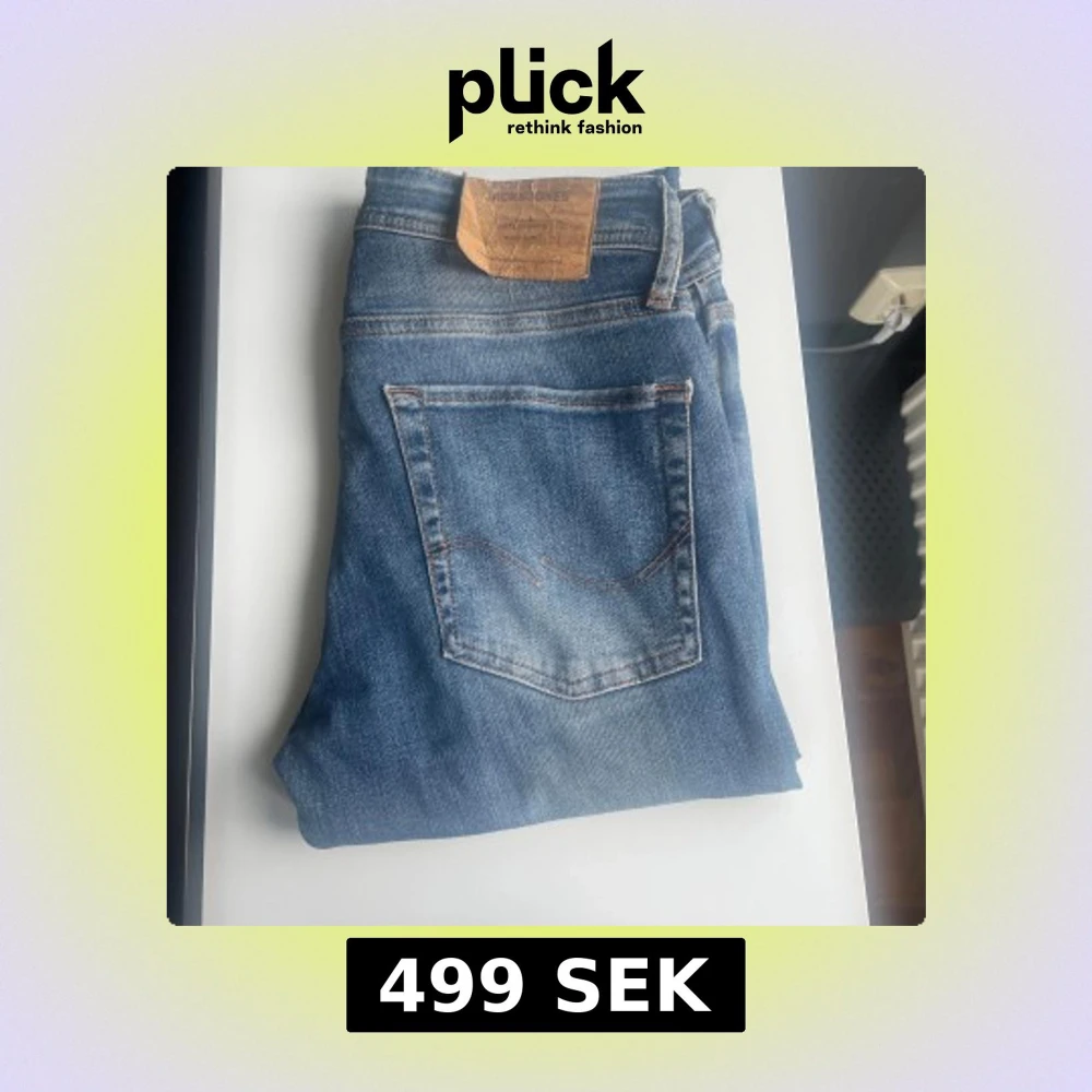 Snygga blå slim fit jeans från Jack & Jones med slitna detaljer och klassisk femficksdesign. Jeansen har lagom slitningar. Jeans är i strl W28/L30. Ny pris 899kr. Hör av dig vid mer frågor!