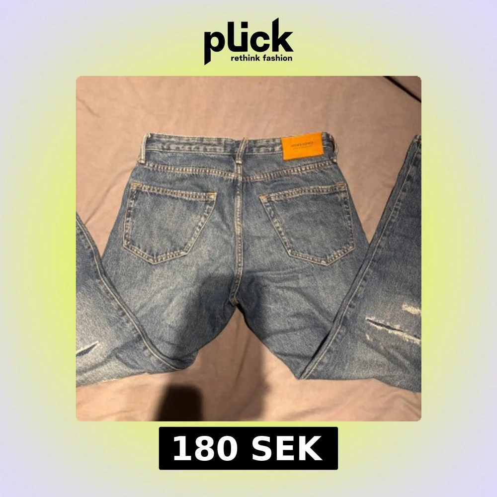Säljer ett par blå jeans från Jack & Jones med designade slitningar och detaljer på benen. Klassisk femficksmodell med relaxed passform och raka ben. Jeansen har en snygg vintagekänsla och är tillverkade i robust denim. Strl 29/32. Använt nån gång med mest bara tagit plats i garderoben.