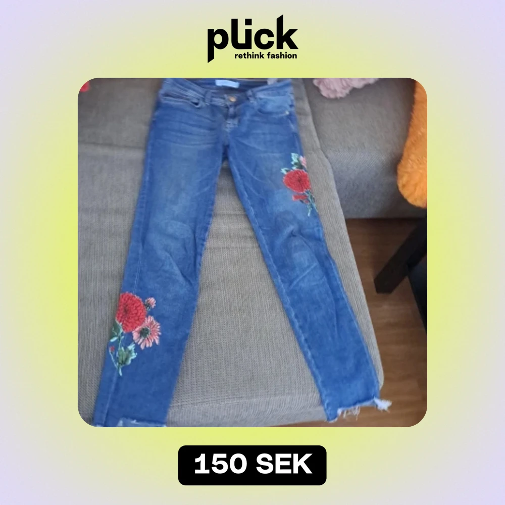 Säljer ett par snygga blå jeans med blommigt broderi på benen. De har en skinny passform. Perfekta för en casual look med en twist! De har en klassisk femficksdesign och en dragkedja med knapp framtill. Kedjan är trasigt. Det går att fixa.