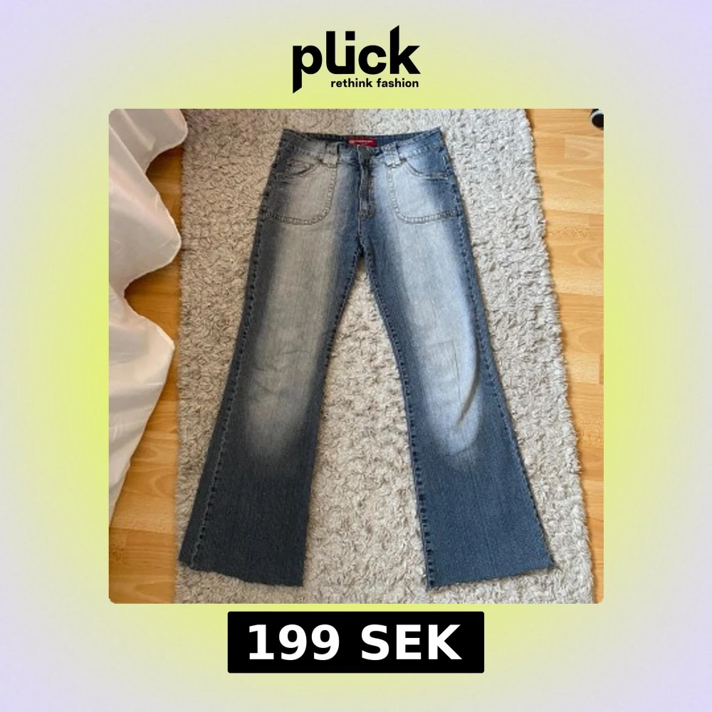 Snygga blå jeans med en bootcut-stil och ljusa slitningar på framsidan. De har en klassisk femficksdesign och är perfekta för en avslappnad look. Jätte fint skick! Påminner om dom populära weekday jeansen!