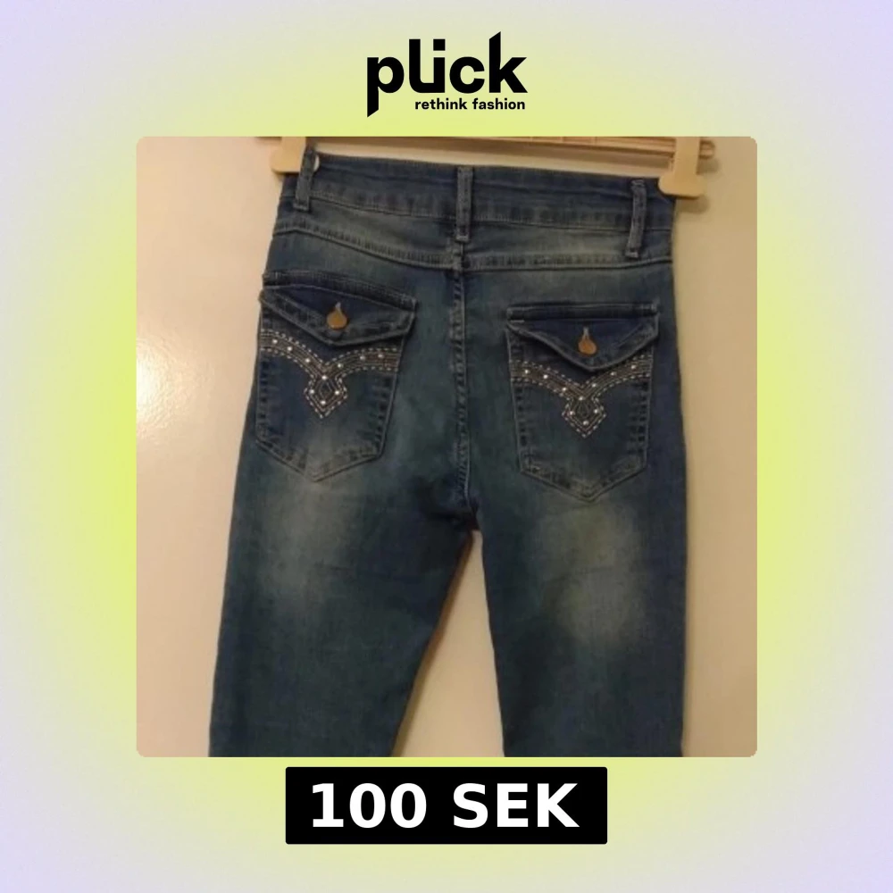Säljer ett par väldigt snygga blåa utsvängda jeans med broderade detaljer på bakfickorna💙🤩. Xs men känns lite mer som S.
