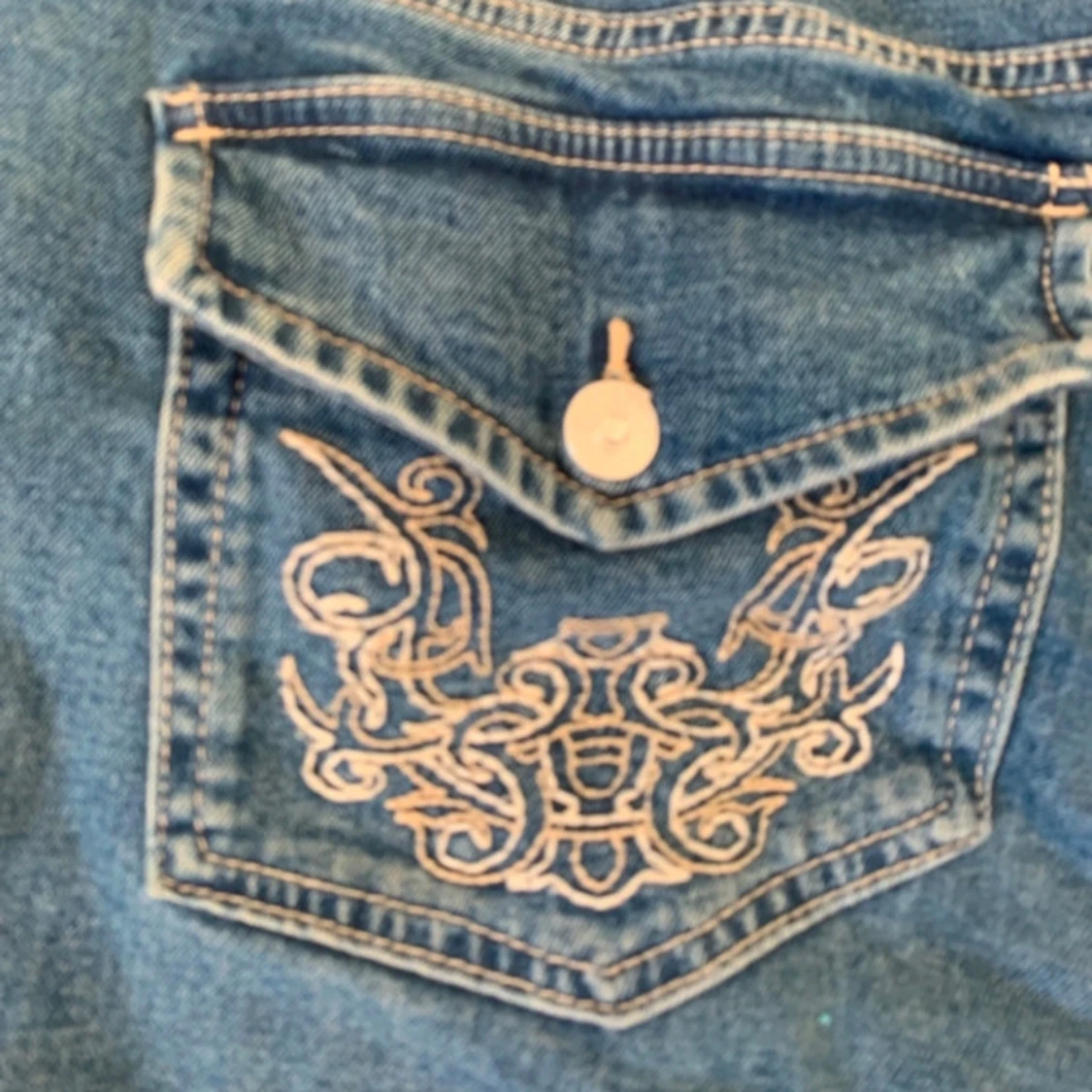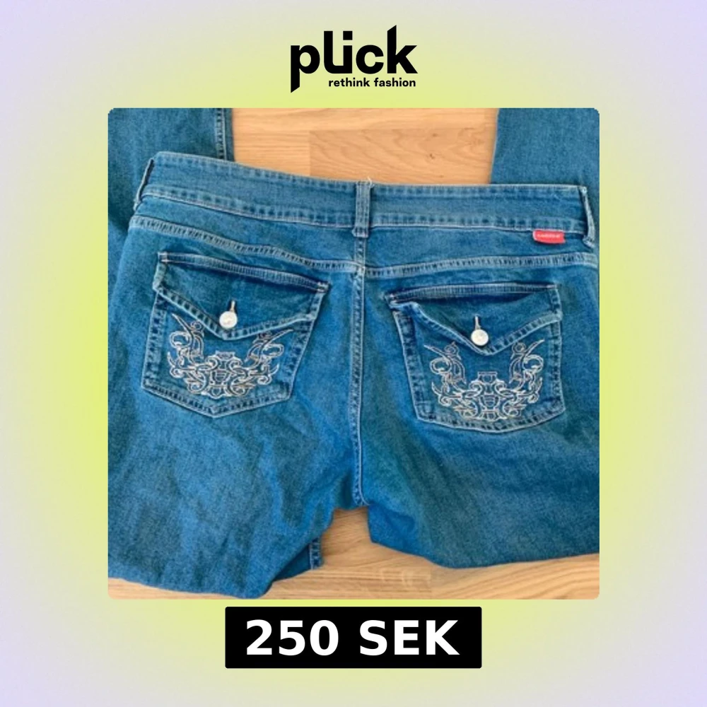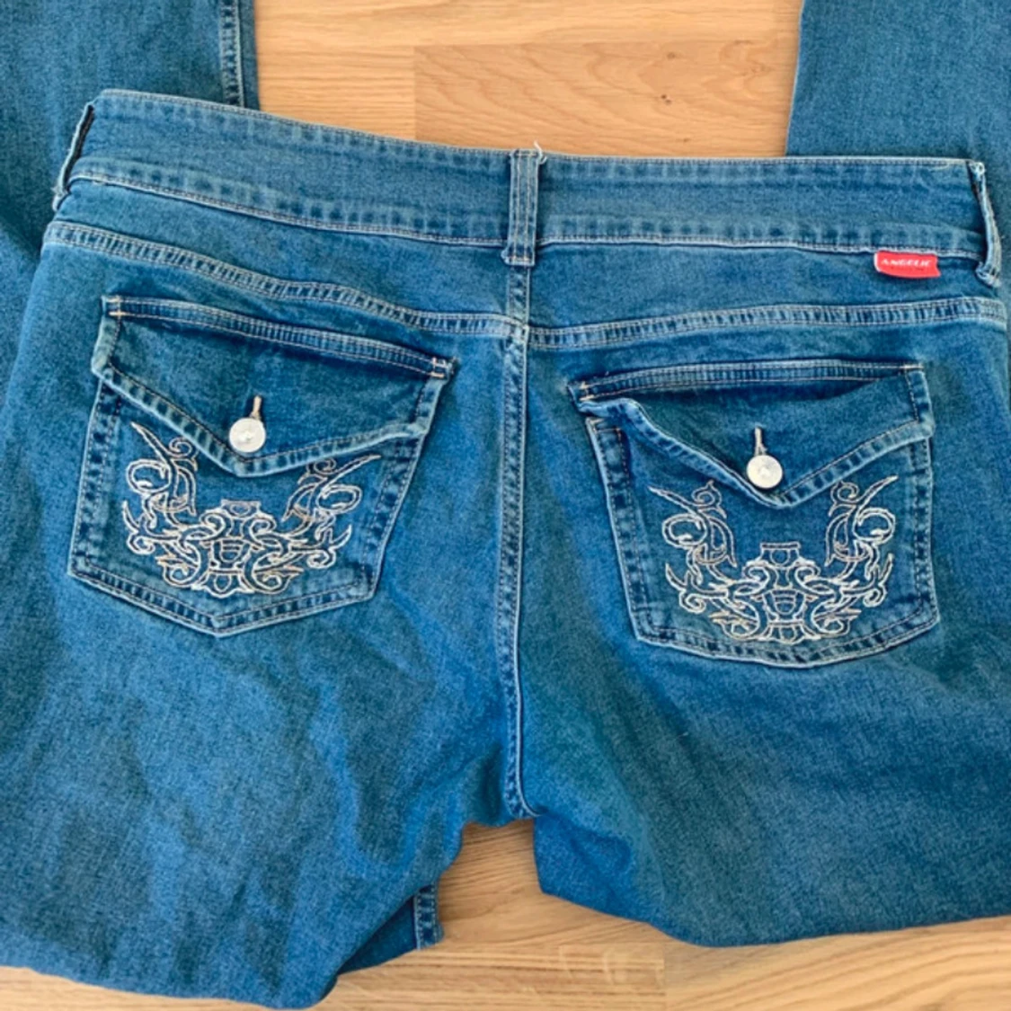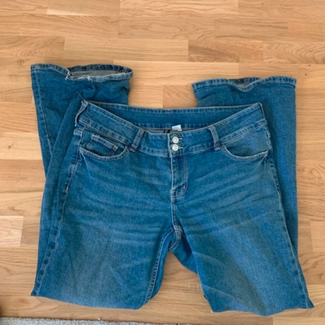 Slutsålda HM bootcut jeans. Snygga blå jeans med unika broderade detaljer på bakfickorna. De har en klassisk femficksdesign och knappar framtill. Perfekta för en avslappnad stil med en touch av elegans. Använda max 5 gånger, top skick! Skriv om du undrar nåt!😊🔥