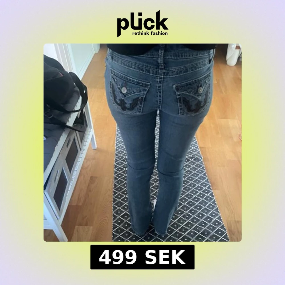 Säljer ett par lågmidjade blå jeans med snygga broderade detaljer på bakfickorna och diamantstenar både fram och bak. Köpta på A2 vintage men märket är Mudd💕