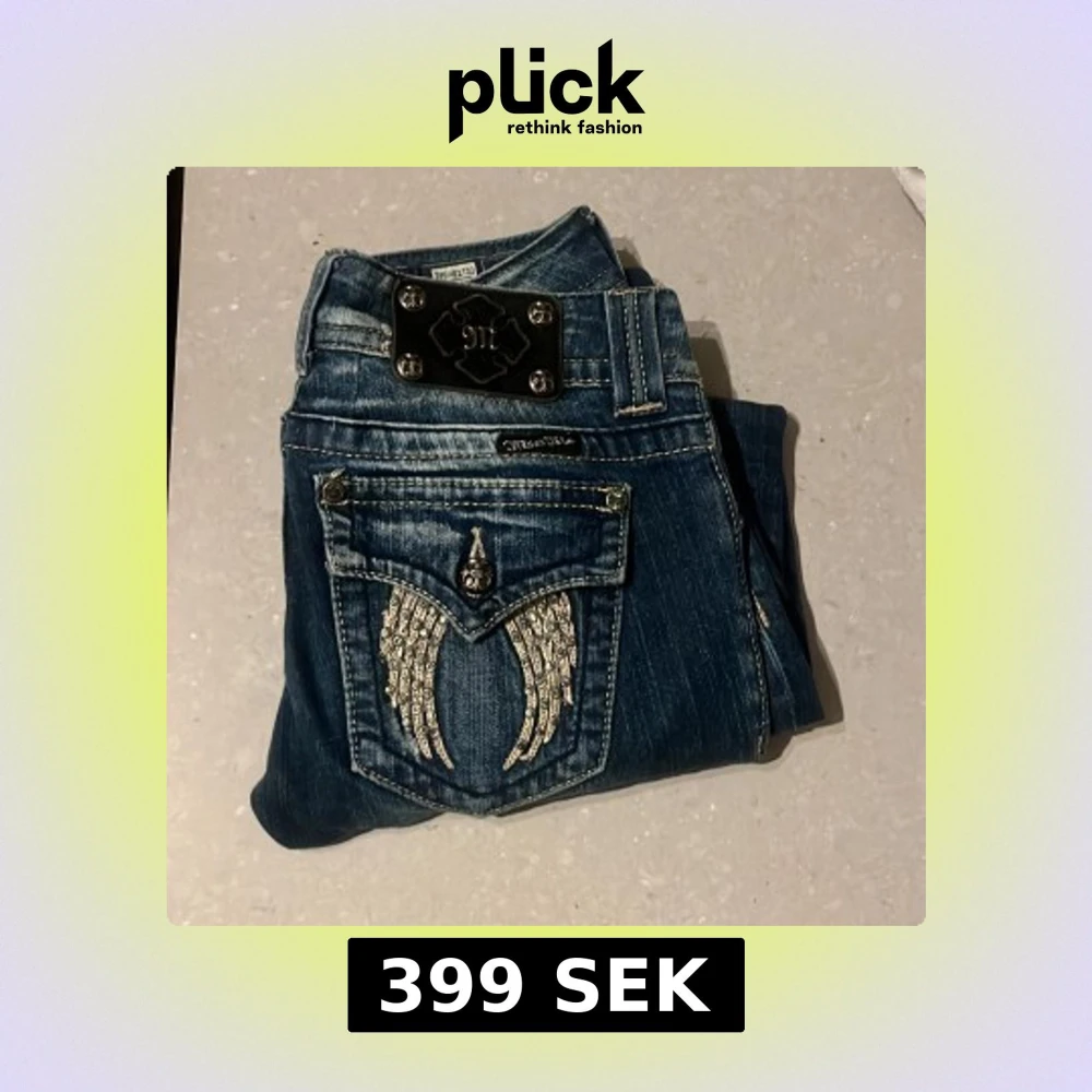 Snygga blå jeans från Miss Me med unika broderade vingdetaljer på bakfickorna. Rak modell men inte skinny!! Sååååå snygga