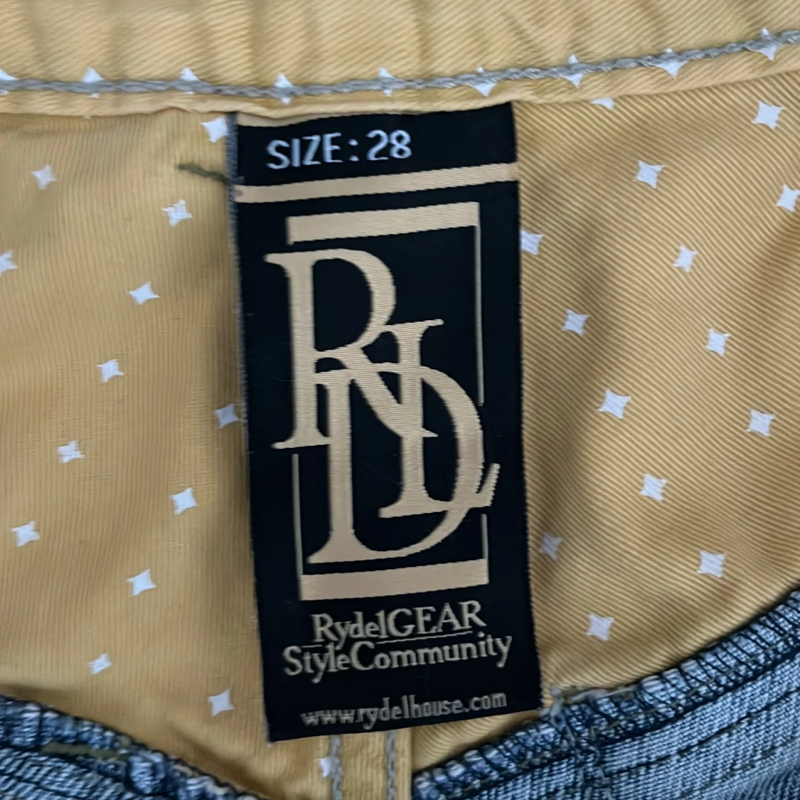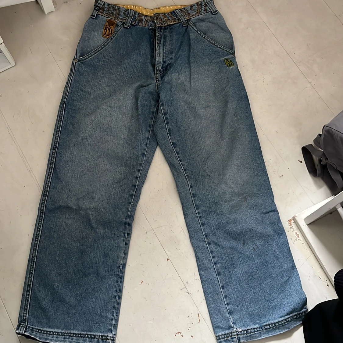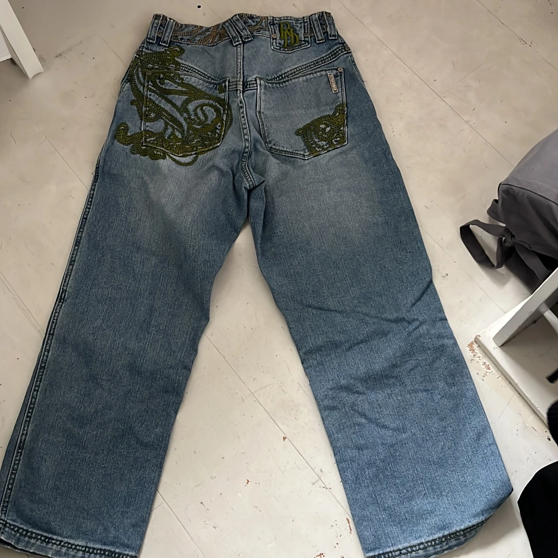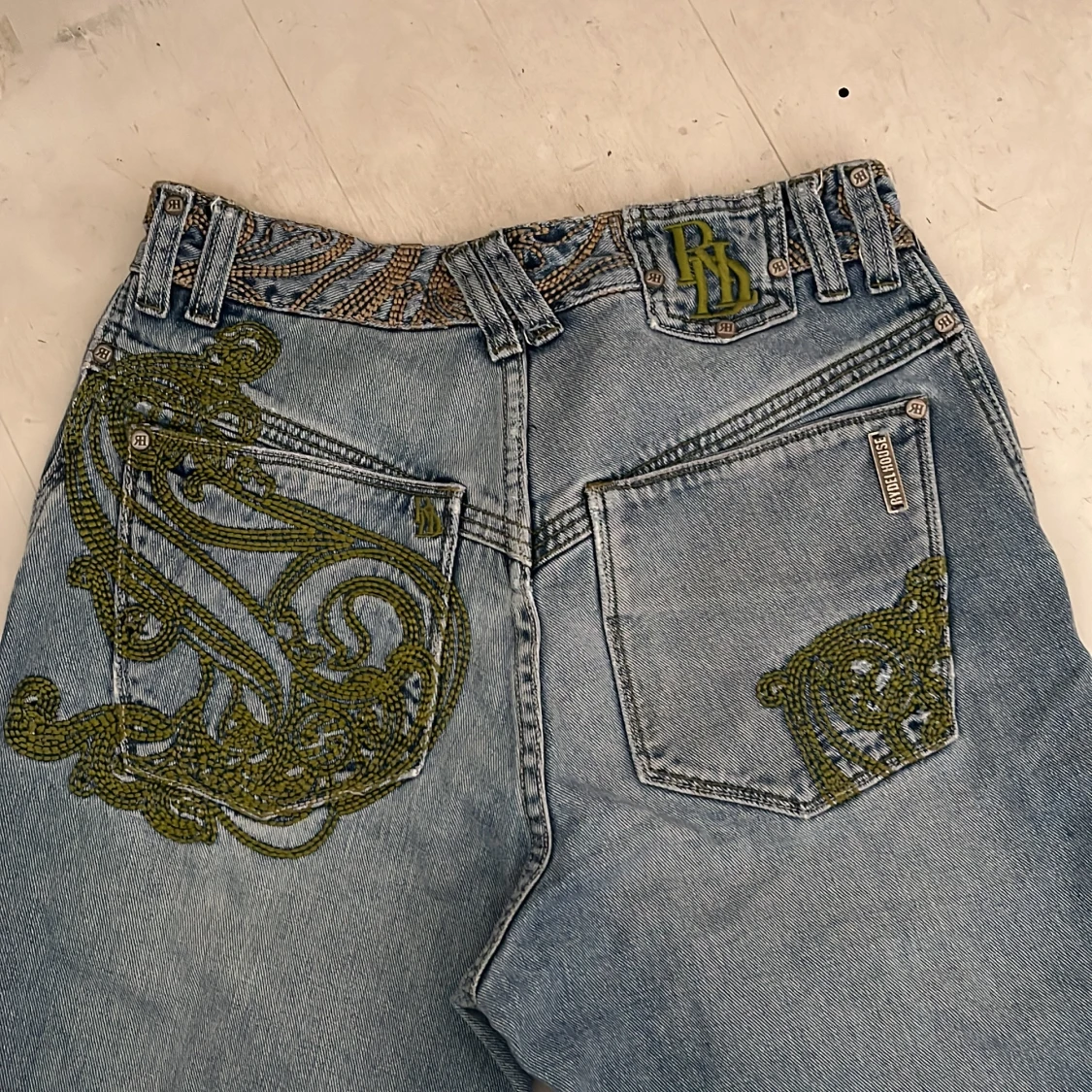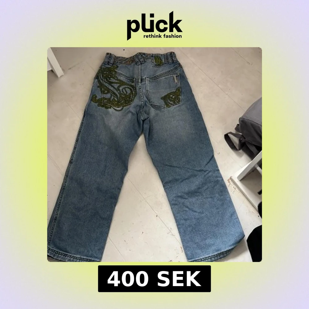 Säljer ett par blå jeans från RydelGEAR med unika gröna broderade mönster på bakfickan och sidan. Jeansen har normal passform och raka ben, samt klassiska fickor och bälteshällor. Är 170 och dem är lite korta på mig, skriv om du vill ha fler bilder. Innerbenslängd 69cm.